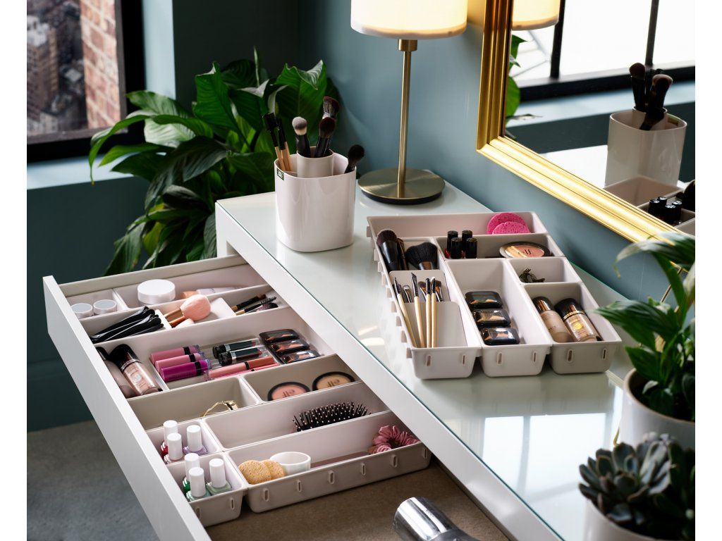 Variabilní 12-ti dílný kosmetický organizér do zásuvky JOSEPH JOSEPH Viva 75009. Plastové misky různých velikostí, které můžete pomocí klipů umístěných na všech bocích misek libovolně spojovat tak, aby jste optimálně zaplnili prostor zásuvky. Více sad lze spojit dohromady a získat tak další úložný prostor. Vhodné k užití pro širokou škálu kosmetických doplňků – štětců na make-up, tužek na oči, laků na nehty, hřebenů, sponek atd.