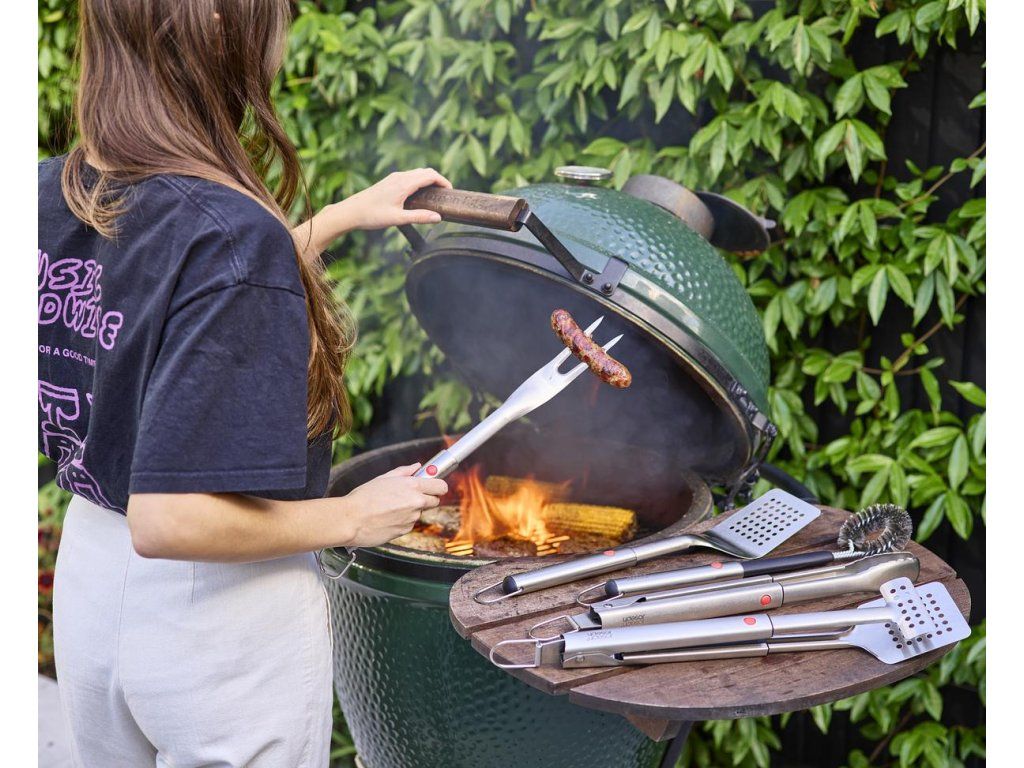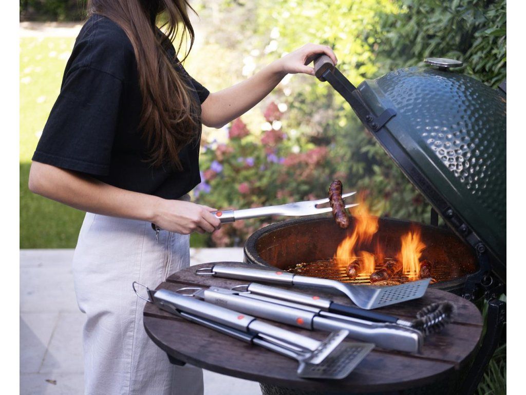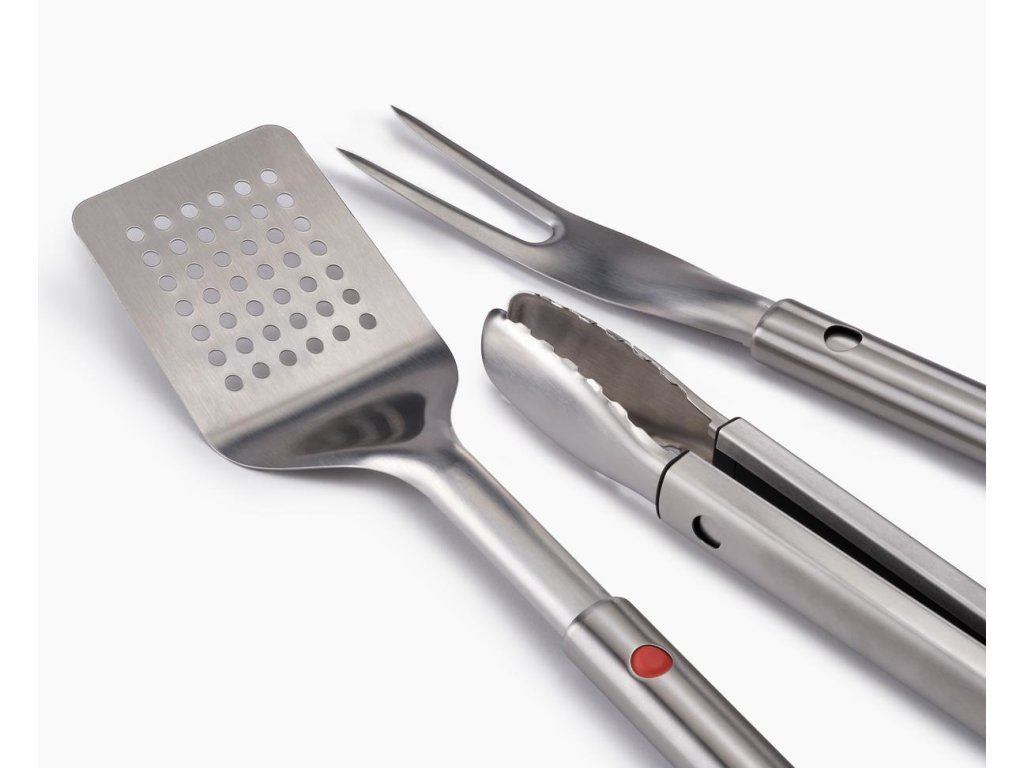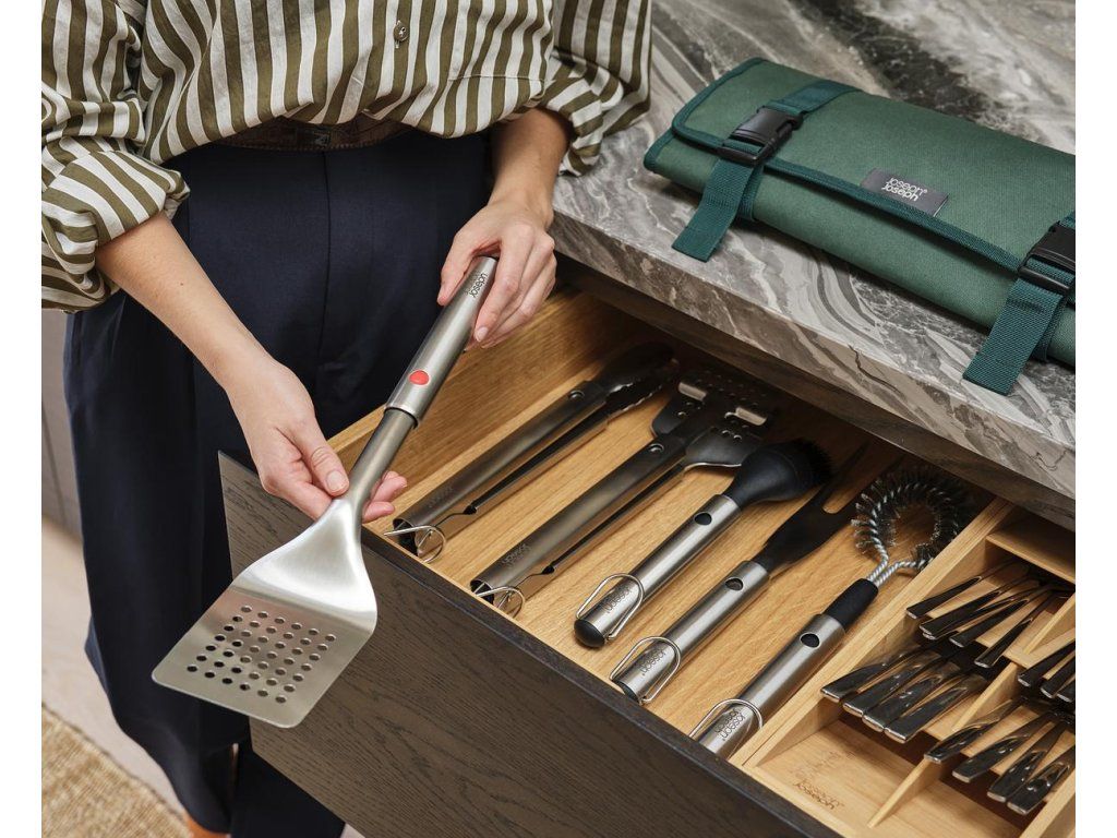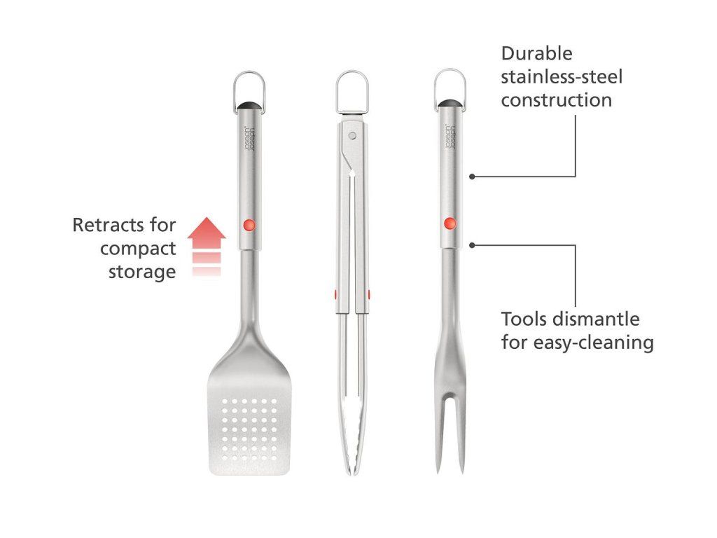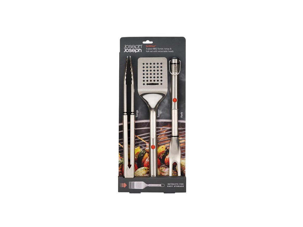 Trojdílná sada grilovacího náčiní JOSEPH JOSEPH GrillOut 2000004 obsahuje kleště, obracečku a vidličku. Pracovní části nástrojů (hlavice) jsou výsuvné. V zasunuté poloze mají kompaktní velikost vhodnou pro skladování v běžných zásuvkách. Nástroje mají odolnou nerezovou konstrukci a jsou opatřeny závěsnými očky. Náčiní je možné mýt v myčce. Nenechávejte náčiní na grilu během vaření, Pozor: Před použitím se ujistěte, že jsou hlavice náčiní zcela vysunuté.