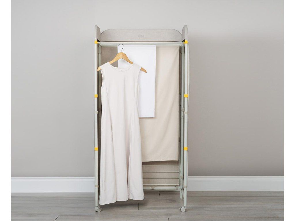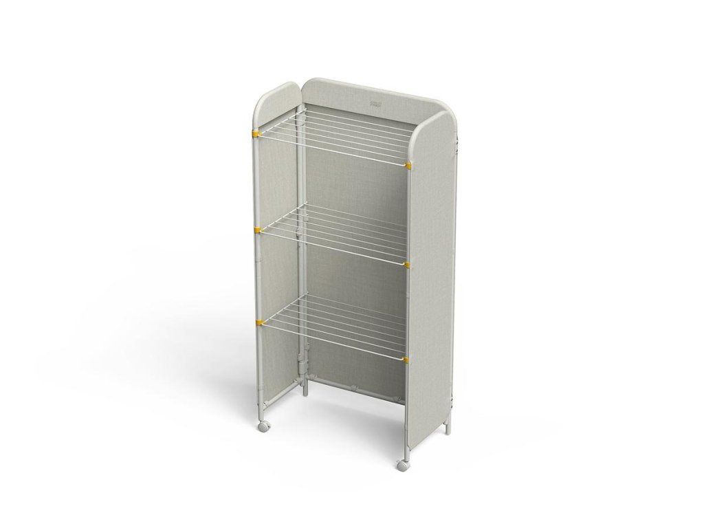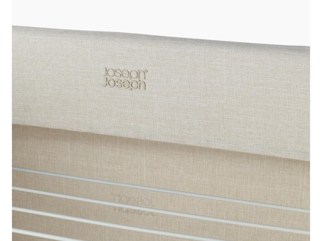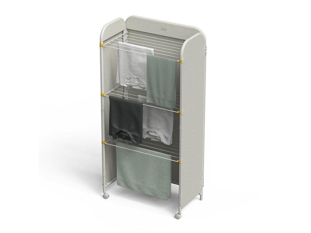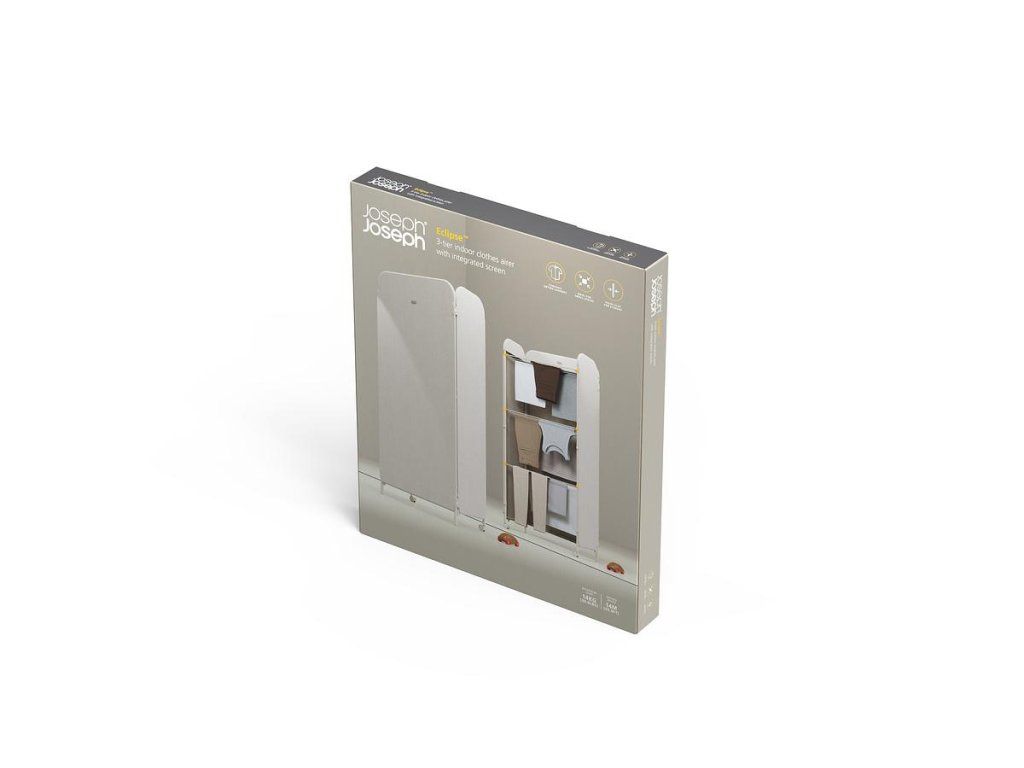 Prostorný třípatrový sušák na prádlo JOSEPH JOSEPH Eclipse je vybaven látkovými boky, které ukryjí sušící se prádlo jako zástěna. Můžete tak sušit přímo v obytném prostoru. Stylová vnější strana chrání před nechtěnými pohledy a svým zpracováním se hodí k řadě interiérových stylů. Kovové sušící rošty nabízejí velkorysý sušicí prostor a lze je jednotlivě sklopit, když potřebujete více místa k sušení delších kusů prádla, jako jsou kalhoty nebo šaty. Třípatrová rámová konstrukce je vyrobena z robustní oceli. Uzamykatelná kolečka usnadňují přemisťování sušáku. Sušák lze složit do plochého stavu pro úsporu místa při skladování. Kapacita sušení: 14 metrů / 14 kg. Barevné provedení Ecru (barva surového hedvábí resp. neběleného plátna).