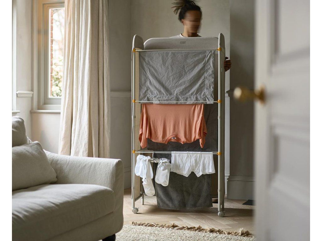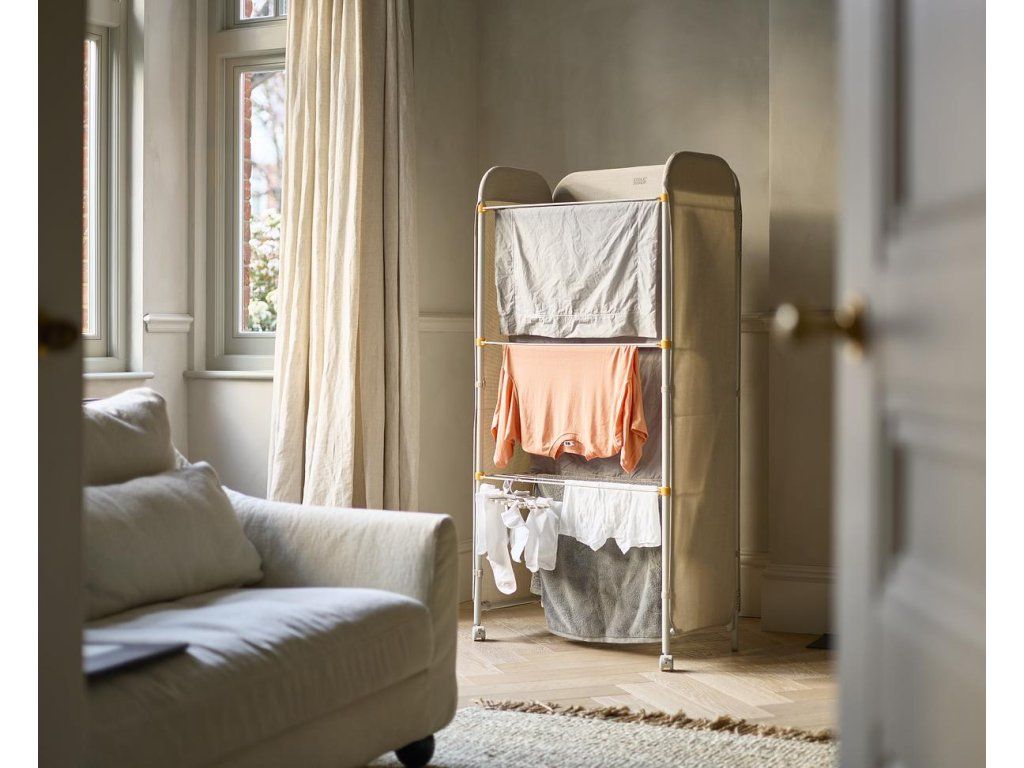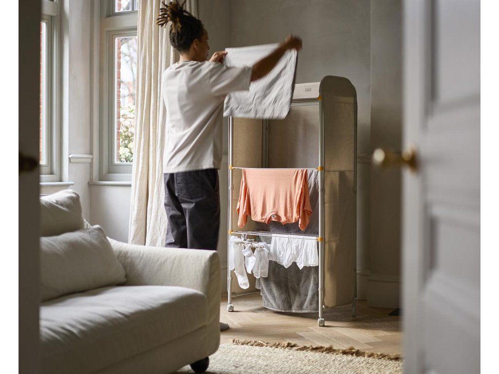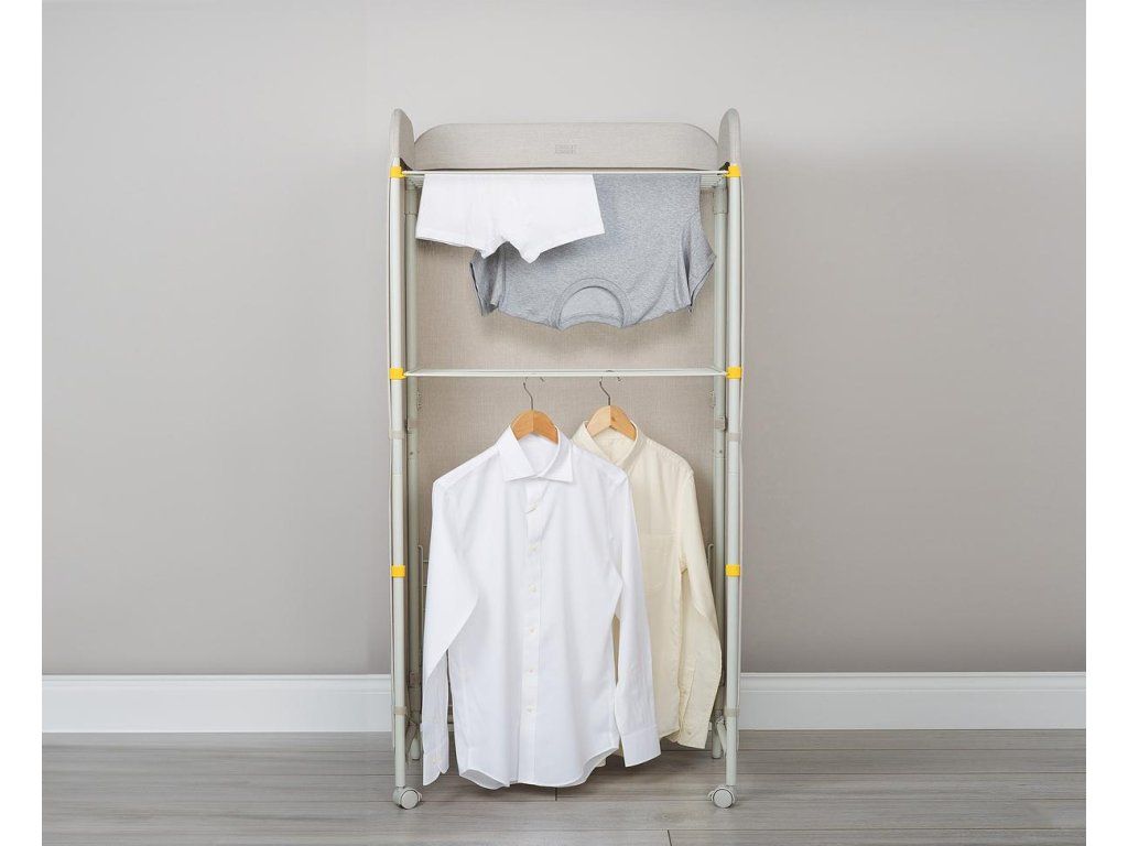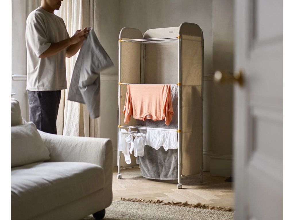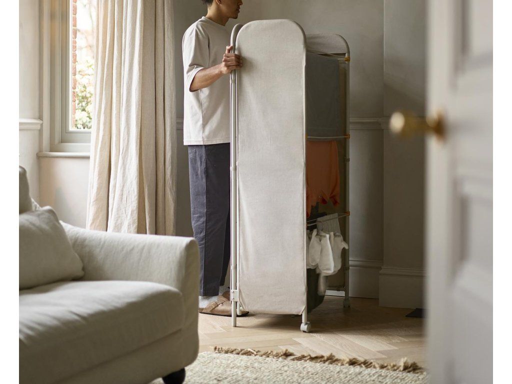 Prostorný třípatrový sušák na prádlo JOSEPH JOSEPH Eclipse je vybaven látkovými boky, které ukryjí sušící se prádlo jako zástěna. Můžete tak sušit přímo v obytném prostoru. Stylová vnější strana chrání před nechtěnými pohledy a svým zpracováním se hodí k řadě interiérových stylů. Kovové sušící rošty nabízejí velkorysý sušicí prostor a lze je jednotlivě sklopit, když potřebujete více místa k sušení delších kusů prádla, jako jsou kalhoty nebo šaty. Třípatrová rámová konstrukce je vyrobena z robustní oceli. Uzamykatelná kolečka usnadňují přemisťování sušáku. Sušák lze složit do plochého stavu pro úsporu místa při skladování. Kapacita sušení: 14 metrů / 14 kg. Barevné provedení Ecru (barva surového hedvábí resp. neběleného plátna).