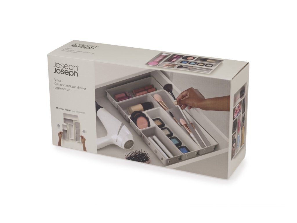 Variabilní 7-mi dílný kosmetický organizér do zásuvky JOSEPH JOSEPH Viva 75009. Plastové misky různých velikostí, které můžete pomocí klipů umístěných na všech bocích misek libovolně spojovat tak, aby jste optimálně zaplnili prostor zásuvky. Více sad lze spojit dohromady a získat tak další úložný prostor. Vhodné k užití pro širokou škálu kosmetických doplňků – štětců na make-up, tužek na oči, laků na nehty, hřebenů, sponek atd.