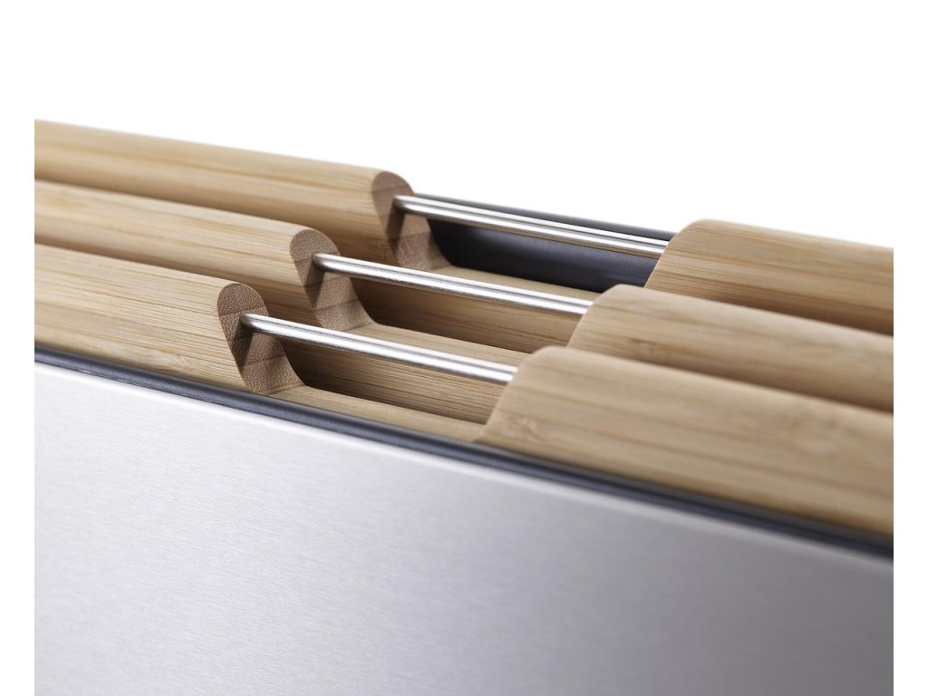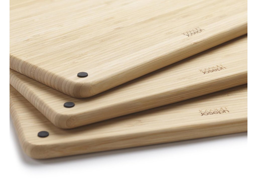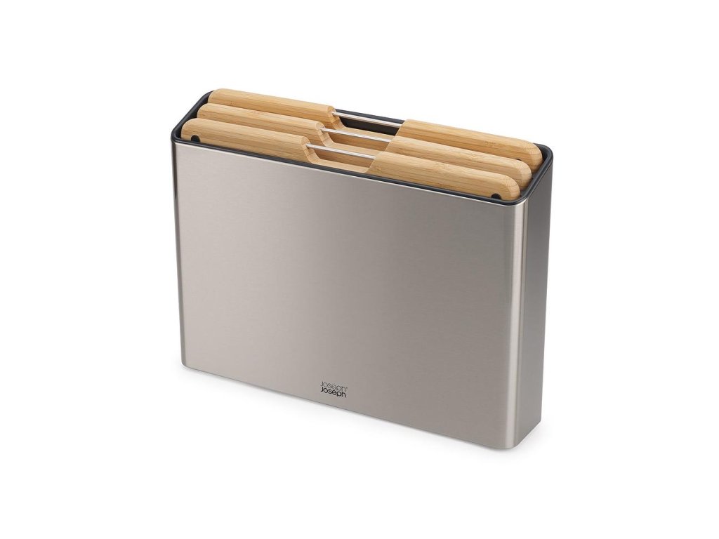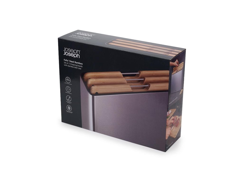 Sada prkének s nerezovým stojanem JOSEPH JOSEPH Folio Icon Steel Bamboo 60229 obsahuje čtyři bambusová prkénka určená pro hygienicky oddělené krájení potravin. Prkénka mají nerezová madélka pro usnadnění vyjmutí a protiskluzné nožky pro lepší stabilitu na pracovní ploše. Díky oddělenému umístění a cirkulaci vzduchu prkénka ve stojanu Folio snadno osychají.