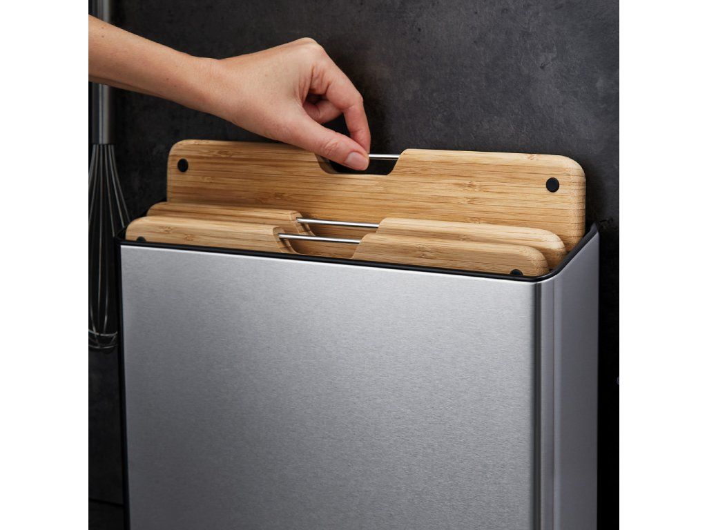 Sada prkének s nerezovým stojanem JOSEPH JOSEPH Folio Steel Bamboo 60229 obsahuje čtyři bambusová prkénka určená pro hygienicky oddělené krájení potravin. Prkénka mají nerezová madélka pro usnadnění vyjmutí a protiskluzné nožky pro lepší stabilitu na pracovní ploše. Díky oddělenému umístění a cirkulaci vzduchu prkénka ve stojanu Folio snadno osychají.