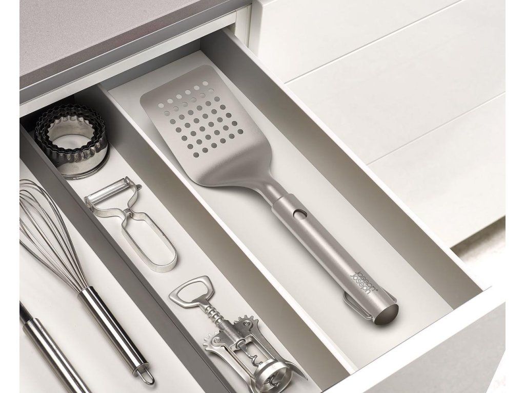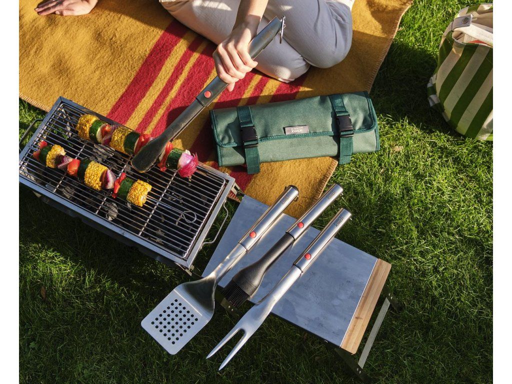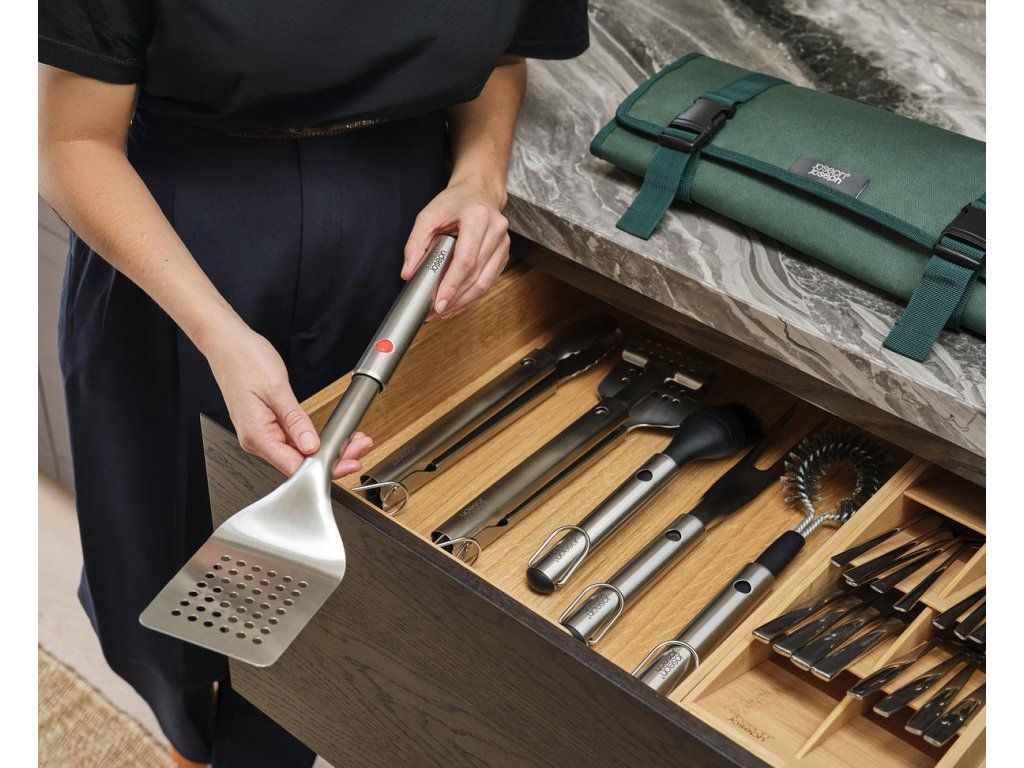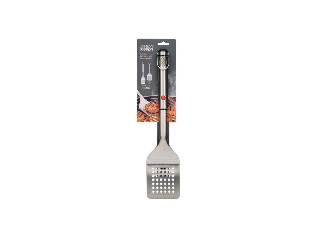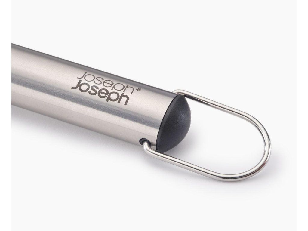 Grilovací štětec na potírání JOSEPH JOSEPH GrillOut 2000005. Pracovní části nástrojů GrillOut jsou výsuvné. V zasunuté poloze mají kompaktní velikost vhodnou pro skladování v běžných zásuvkách. Nástroje mají odolnou nerezovou konstrukci a jsou opatřeny závěsnými očky. Náčiní je možné mýt v myčce. Nenechávejte náčiní na grilu během vaření a neodkládejte jej horké na pouzdro (pouzdro není žáruvzdorné ani vhodné pro kontakt s potravinami). Pozor: Před použitím se ujistěte, že jsou hlavice náčiní zcela vysunuté. Při používání ostrých vidliček buďte opatrní.