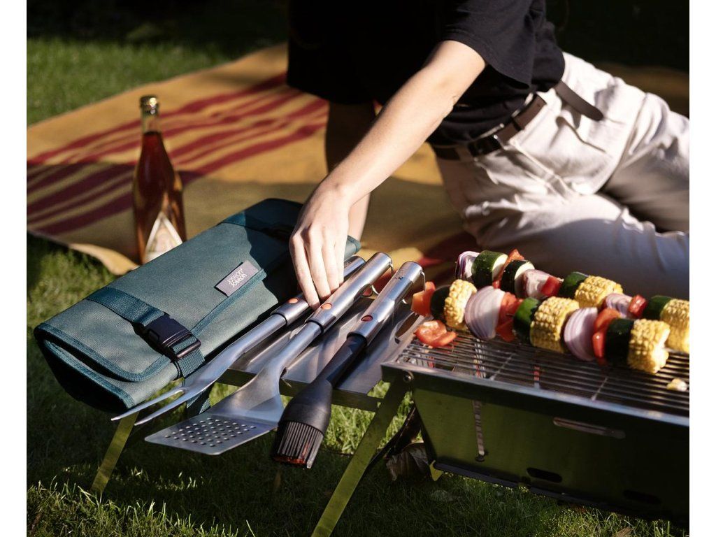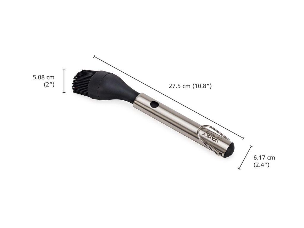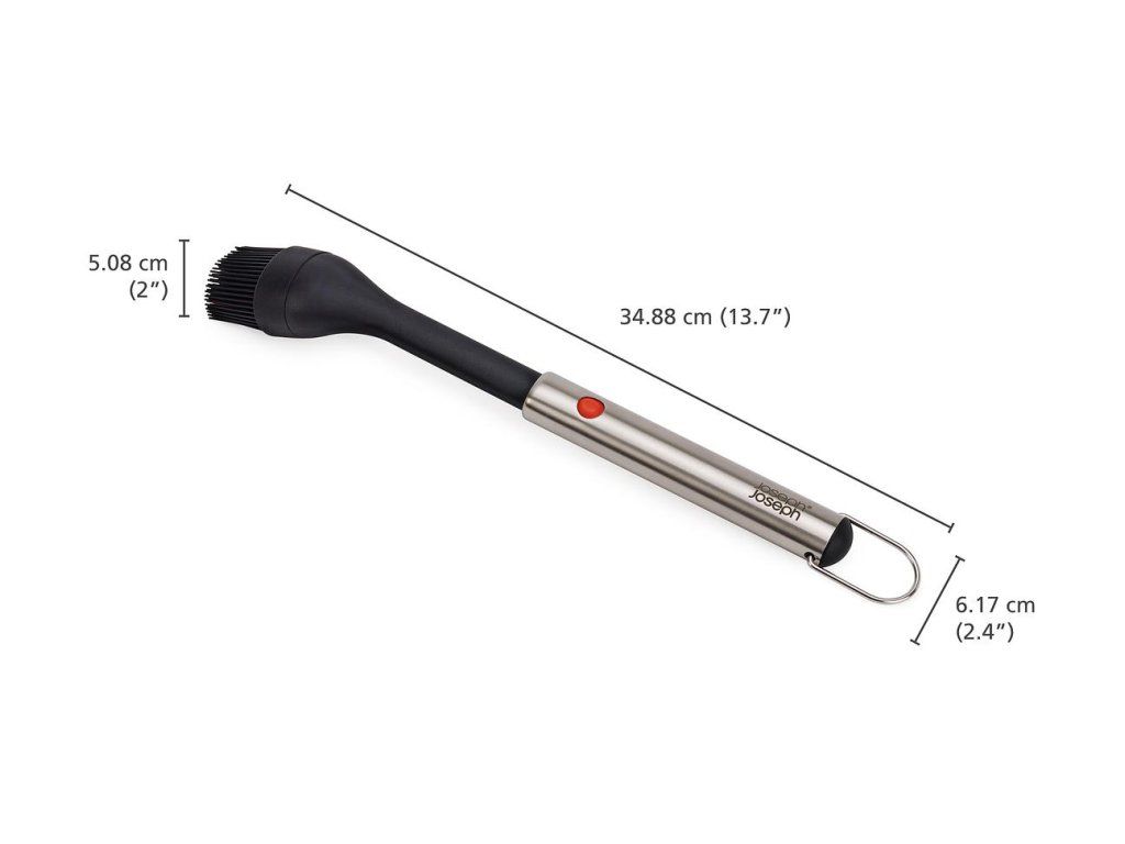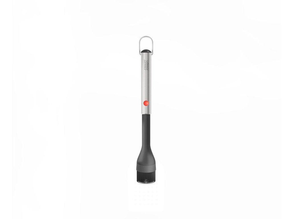Grilovací štětec na potírání JOSEPH JOSEPH GrillOut 2000005. Pracovní části nástrojů GrillOut jsou výsuvné. V zasunuté poloze mají kompaktní velikost vhodnou pro skladování v běžných zásuvkách. Nástroje mají odolnou nerezovou konstrukci a jsou opatřeny závěsnými očky. Náčiní je možné mýt v myčce. Nenechávejte náčiní na grilu během vaření a neodkládejte jej horké na pouzdro (pouzdro není žáruvzdorné ani vhodné pro kontakt s potravinami). Pozor: Před použitím se ujistěte, že jsou hlavice náčiní zcela vysunuté. Při používání ostrých vidliček buďte opatrní.