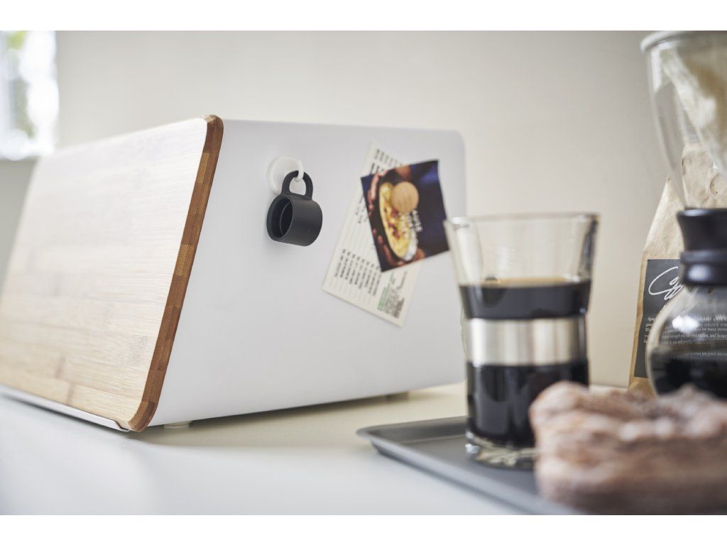 Chlebník s odnímatelným čelním víkem / prkénkem - YAMAZAKI 5290. Materiál kov / bambus. Velikost: 18,5 x 31 x 24,5 cm (VxŠxH).