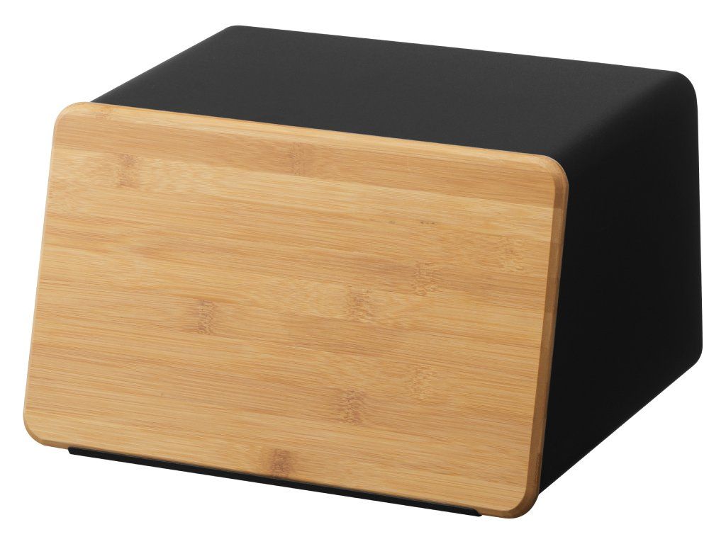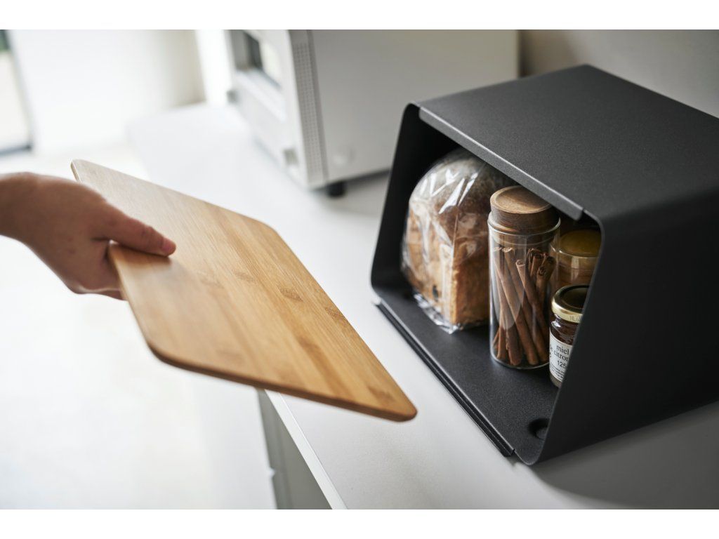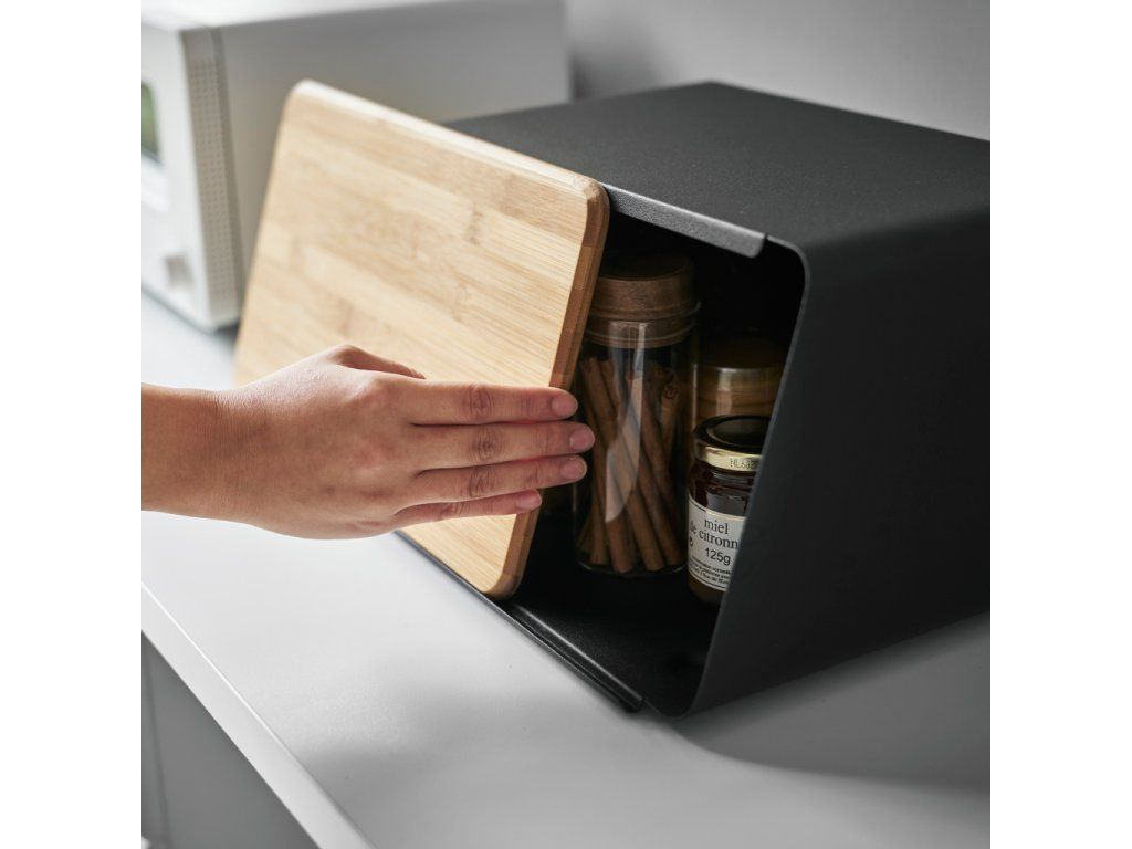 Chlebník s odnímatelným čelním víkem / prkénkem - YAMAZAKI 5291. Materiál kov / bambus. Velikost: 18,5 x 31 x 24,5 cm (VxŠxH).