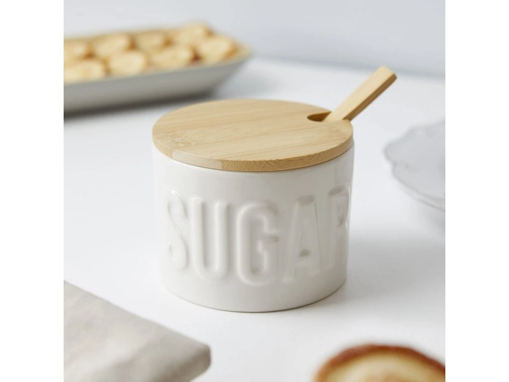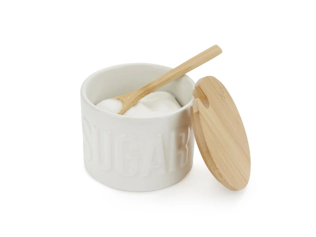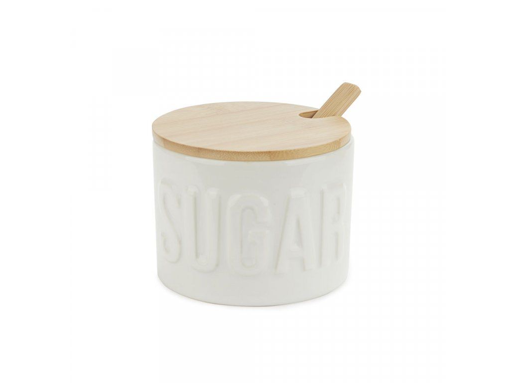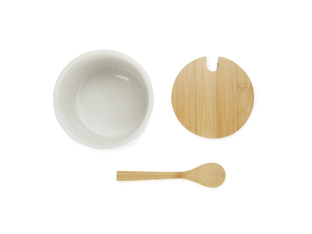 Keramická cukřenka BALVI 27796 s bambusovým víčkem a lžičkou. Velikost: 7,4 x 9,5 x 9,5 cm (VxŠxH).