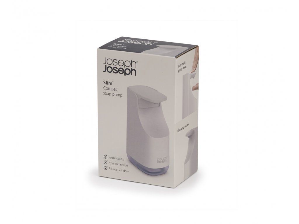 Úzký dávkovač JOSEPH JOSEPH 70578 Slim o obsahu zabírá méně místa než běžné dávkovače. Velká hlavice umožňuje snadné stisknutí mechanické pumpy. Okénko na zadní straně upozorní, kdy je třeba dávkovač doplnit. Barevné provedení Ecru (barva surového hedvábí resp. neběleného plátna).