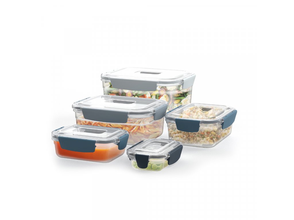 Nádoby na potraviny JOSEPH JOSEPH Nest™ Lock elegantně řeší problémy obvyklé u obdobných typů výrobků – prostorovou neúspornost, nutnost odděleného skladování nádobek a víček a s tím spojený problém správného spárování.