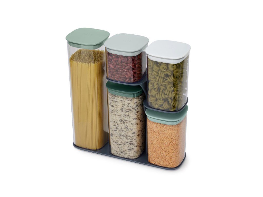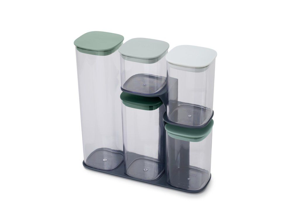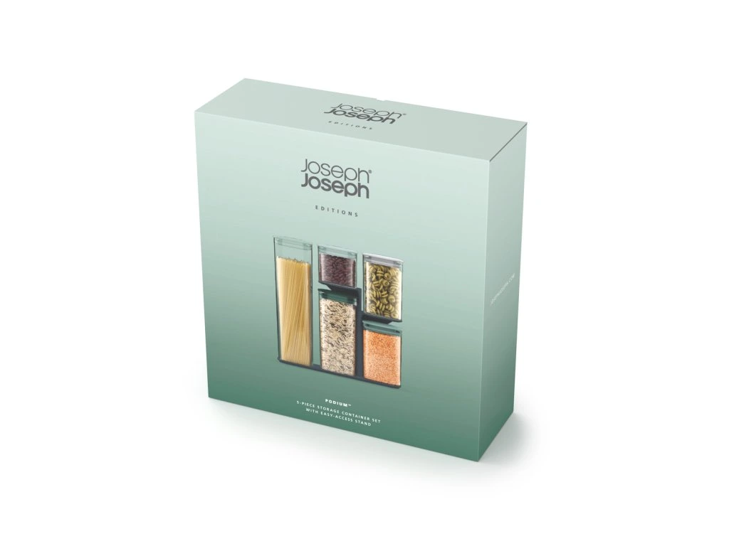 Dózy se stojanem JOSEPH JOSEPH Podium v limitované luxusní sérii Editions Sage. Sada dóz s praktickým stojanem umožňující snadné vyjmutí jednotlivých nádob nezávisle na jejich pozici ve stojanu. Dózy jsou určeny ke skladování suchých potravin. Uzávěry mají silikonové těsnění.