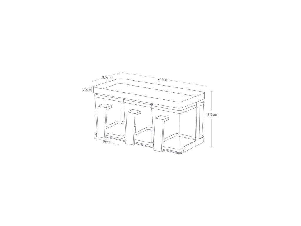 YAMAZAKI Tower Seasoning Box - dózy s poličkou. Kovový stojánek se třemi plastovými dózami s madlem. Dózy o obsahu 650 ml. Součástí sady je malá odměrná lžička (5ml).Velikost: 27,5 x 11,5 x 13,5 cm.