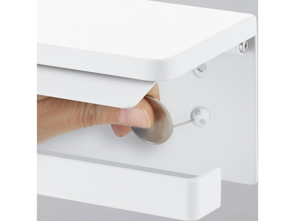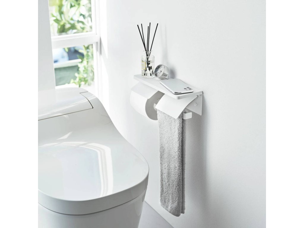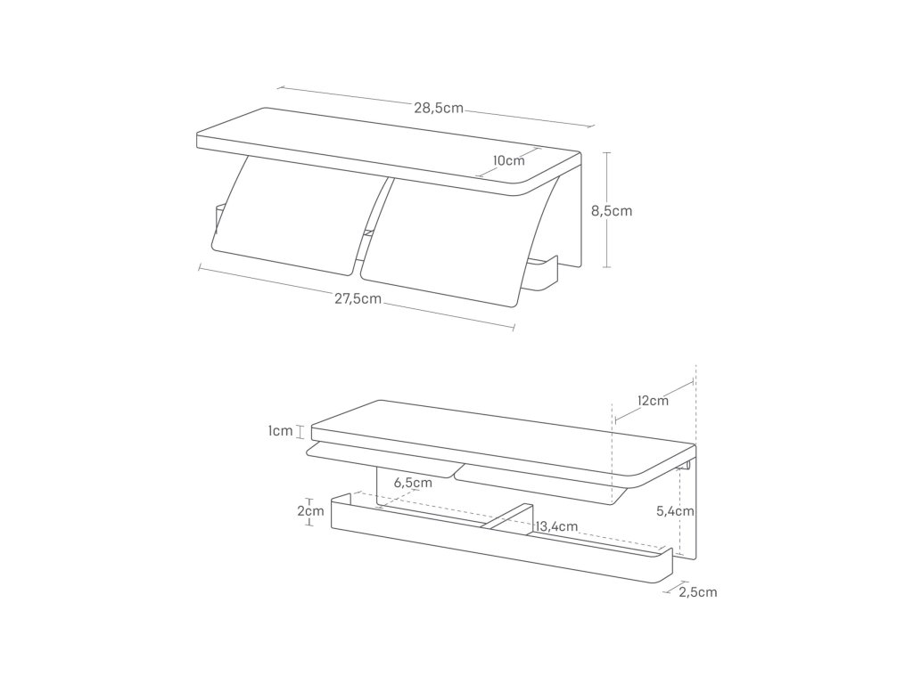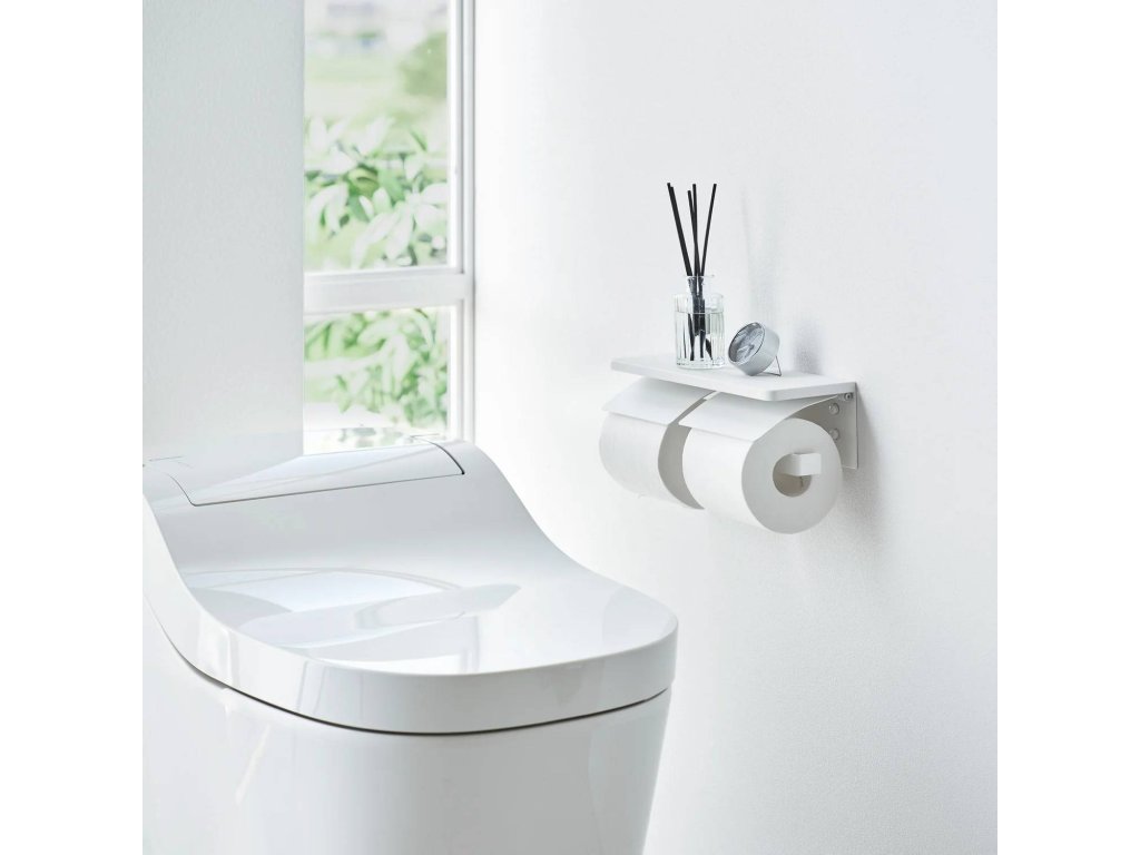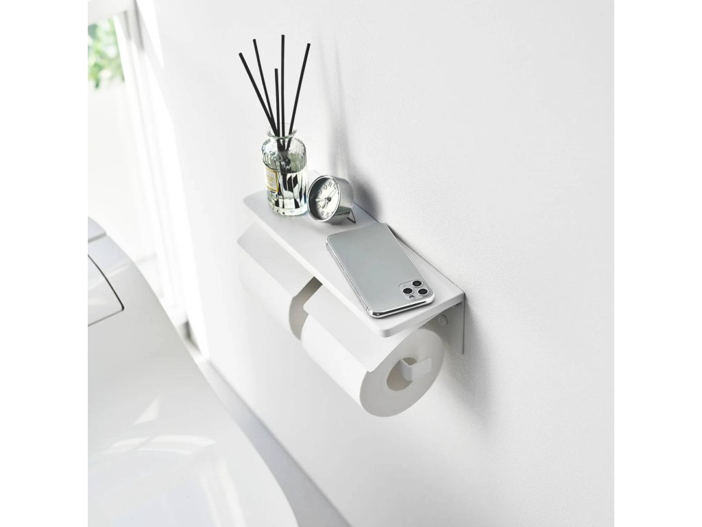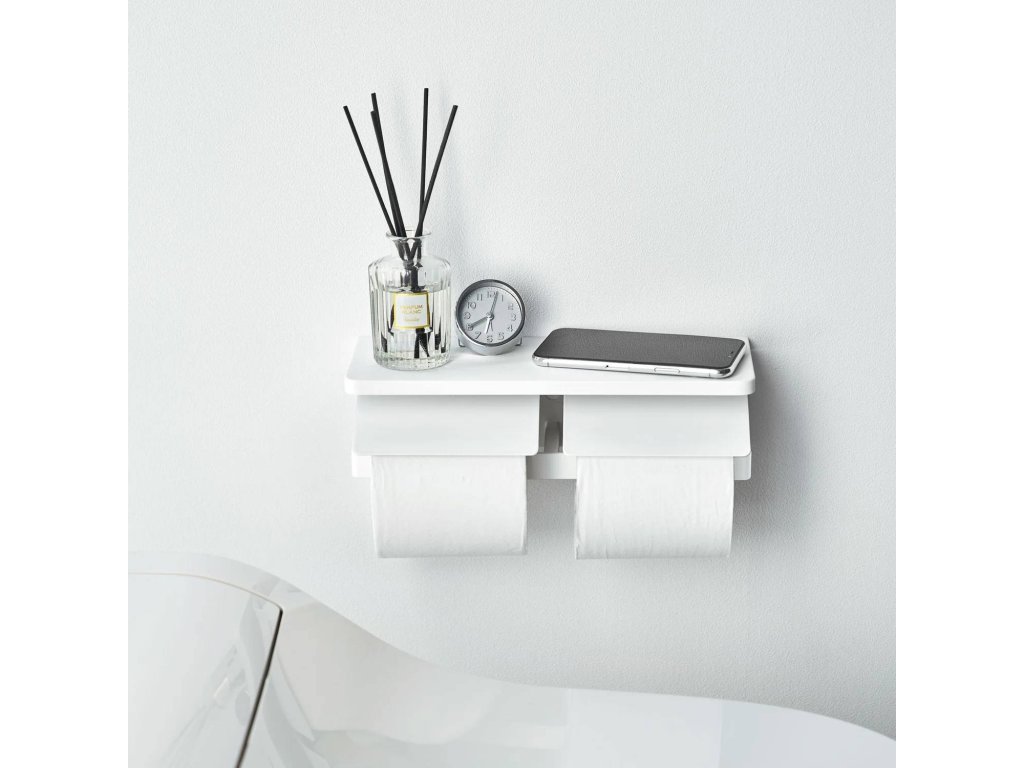 Kovový dvojitý držák toaletního papíru s horní odkladnou poličkou a snadným bočním plněním – YAMAZAKI Tower 1299 (bílý) / 1300 (černý). Držák se na zeď upevňuje pomocí přiložených kolíčků nebo šrouby. Horní plocha může posloužit k odložení malých koupelnových potřeb nebo telefonu.