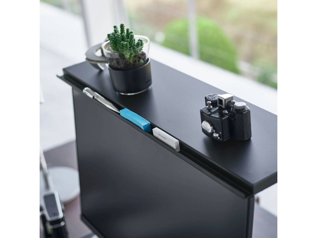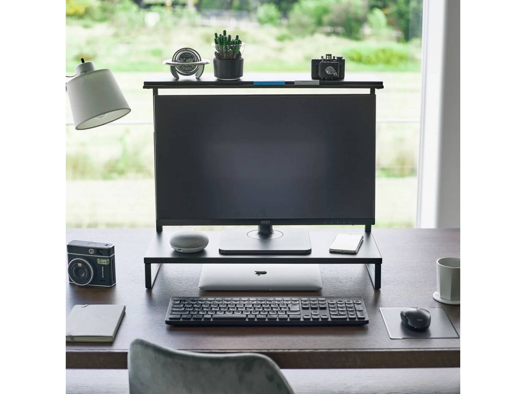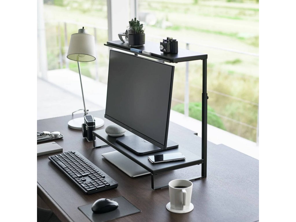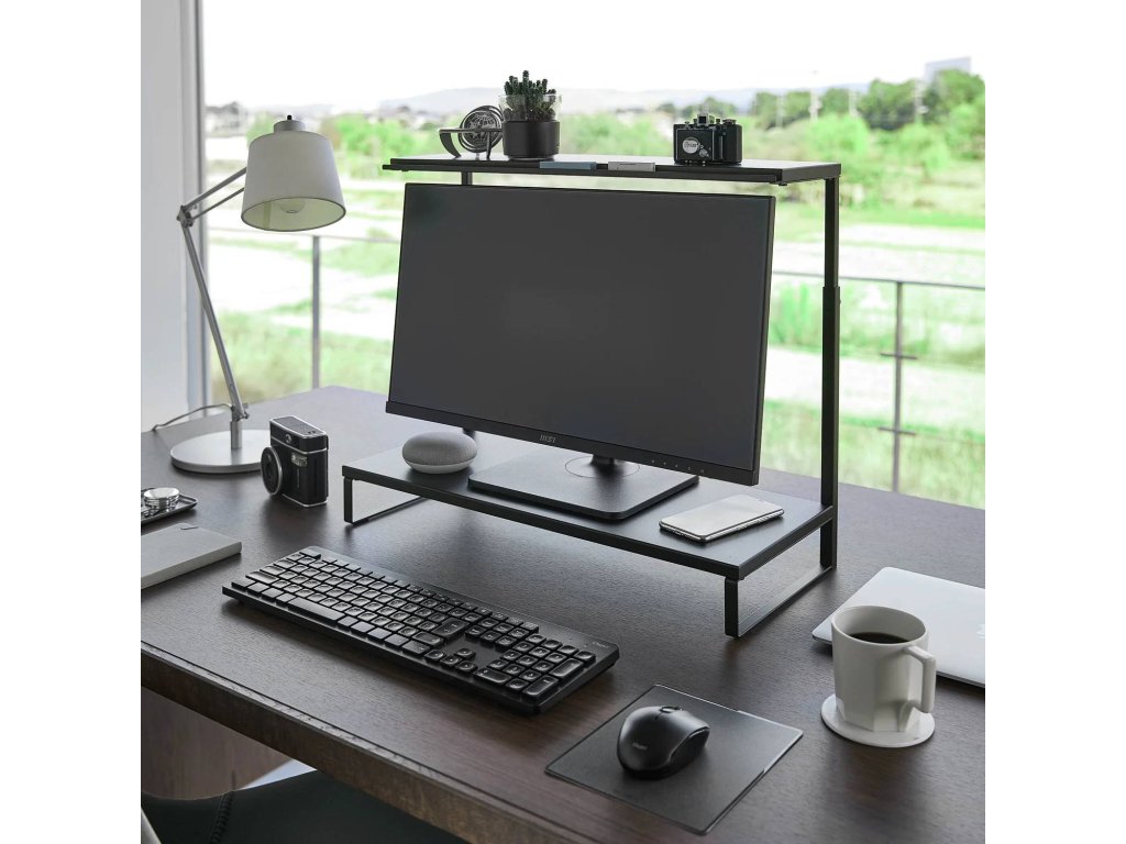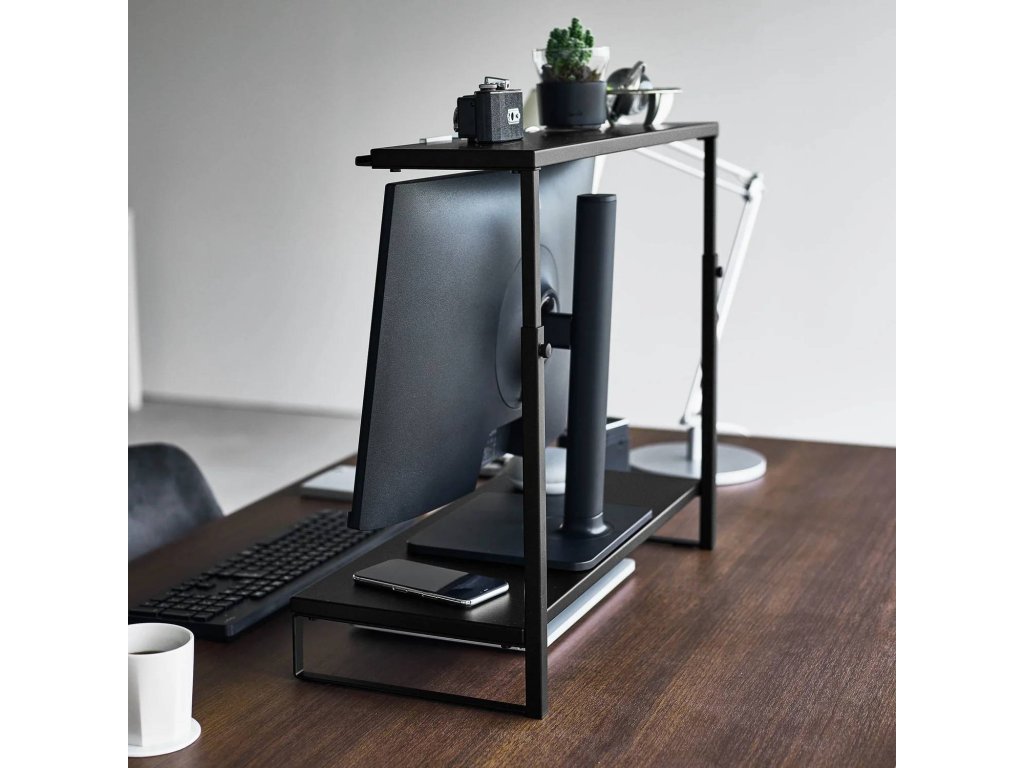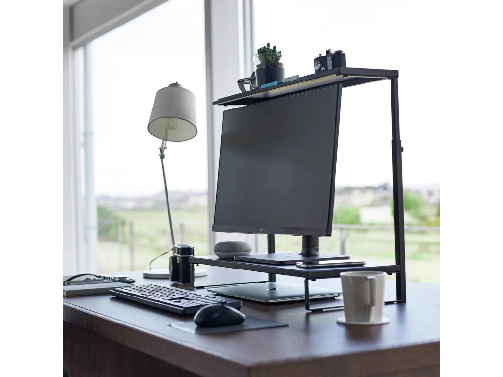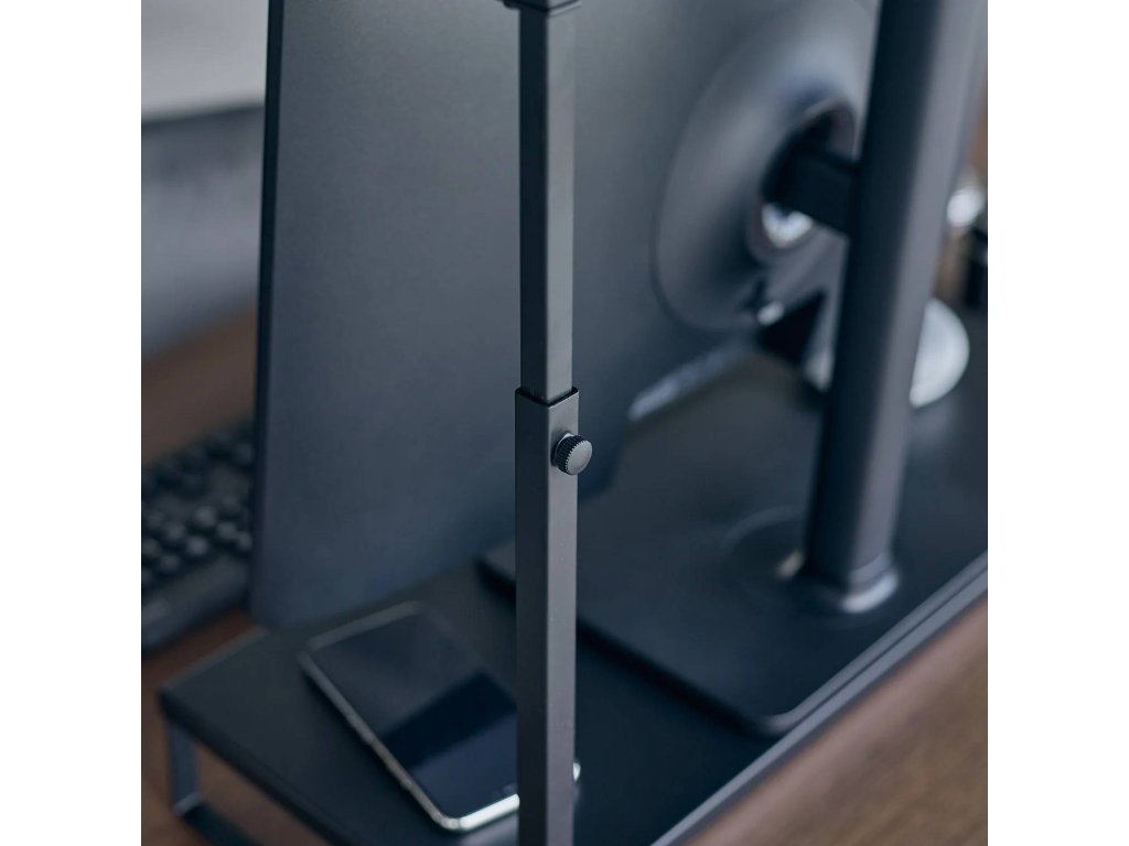 Výškově nastavitelný kovový stojan na monitor se dvěma policemi YAMAZAKI Tower 1302 (bílý) / 1303 (černý). Horní police s drážkou na kancelářské potřeby. Prostor pod spodní policí vhodný k odložení klávesnice. Vhodný pro monitory o uhlopříčce 24-27 palců.