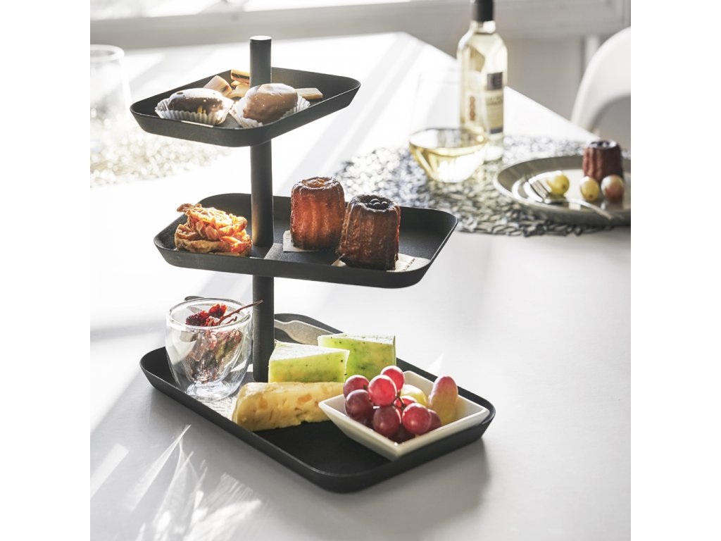 Servírovací stojan YAMAZAKI Tower 4281 se třemi otočnými miskami. Vhodný k servírování tapas i cukroví. Materiál: lakovaný kov. Velikost: 24,7 x 15,7 x 25,7 cm.