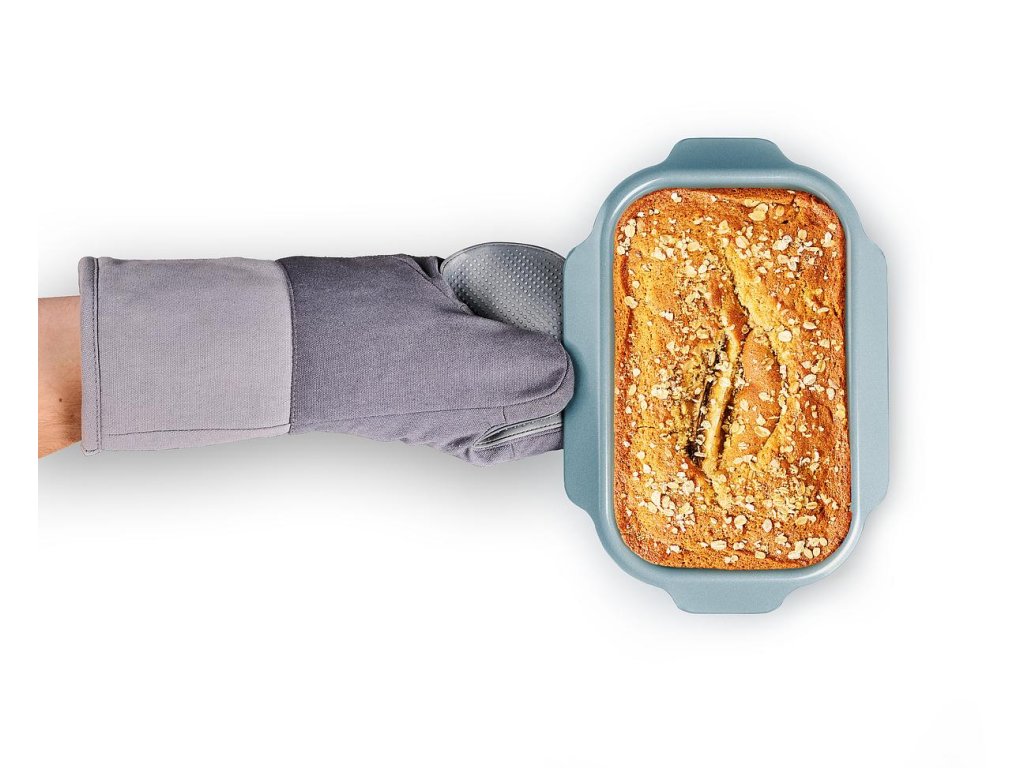 Stohovatelná forma na 2lb (0,9kg) bochník chleba JOSEPH JOSEPH Nest™ Bake 45071. Forma je ergonomicky tvarována tak, aby postranní velké rukojeti umožňovali snadné uchopení s kuchyňskými rukavicemi nebo chňapkami. Je vyrobena z těžké uhlíkové oceli s odolným dvouvrstvým nepřilnavým povrchem bez obsahu PTFE, PFAS, PFOA, olova a kadmia.