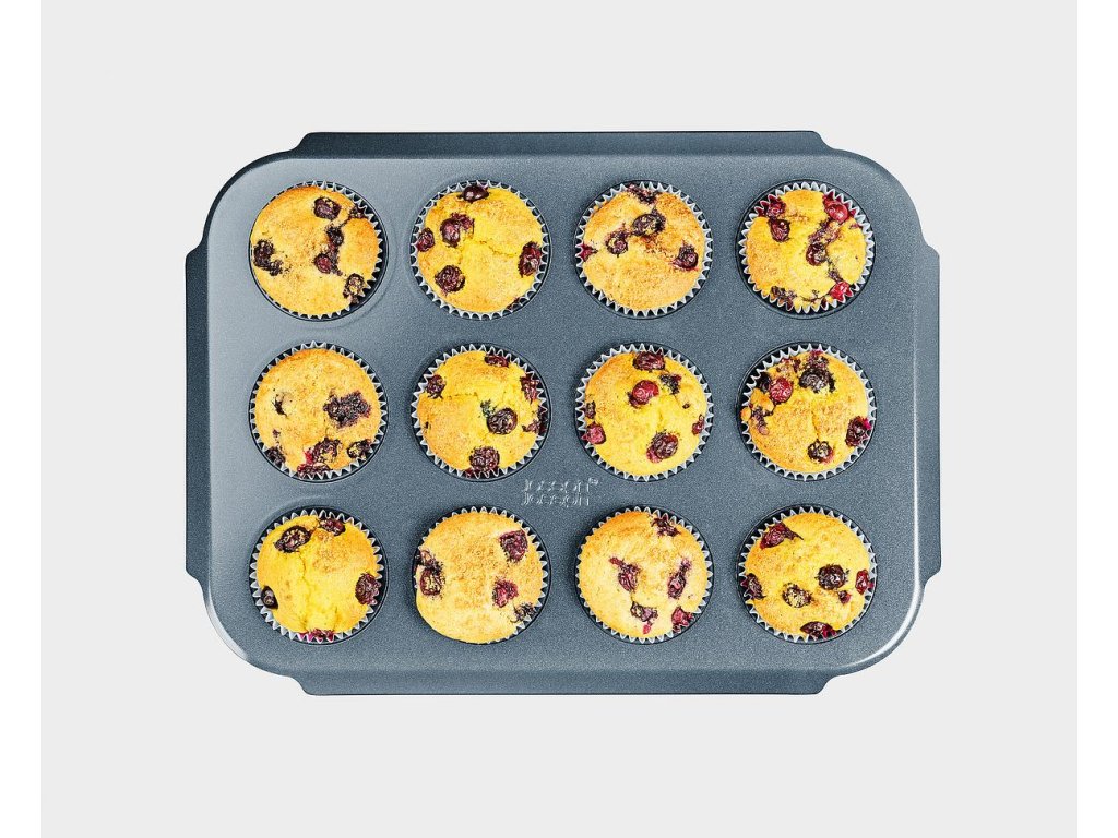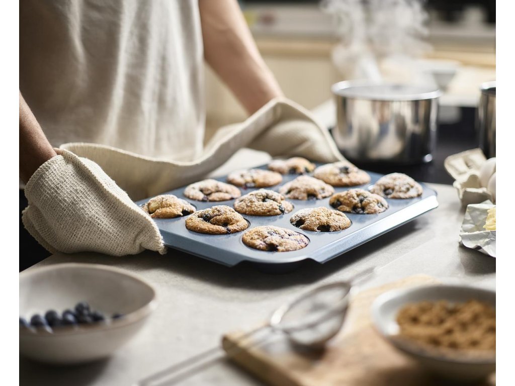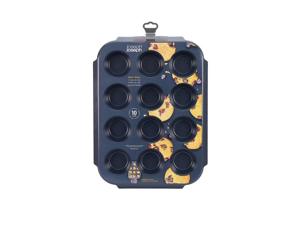 Stohovatelná forma na 12 muffinů JOSEPH JOSEPH Nest™ Bake 45072. Forma je ergonomicky tvarována tak, aby postranní velké rukojeti umožňovali snadné uchopení s kuchyňskými rukavicemi nebo chňapkami. Je vyrobena z těžké uhlíkové oceli s odolným dvouvrstvým nepřilnavým povrchem bez obsahu PTFE, PFAS, PFOA, olova a kadmia.