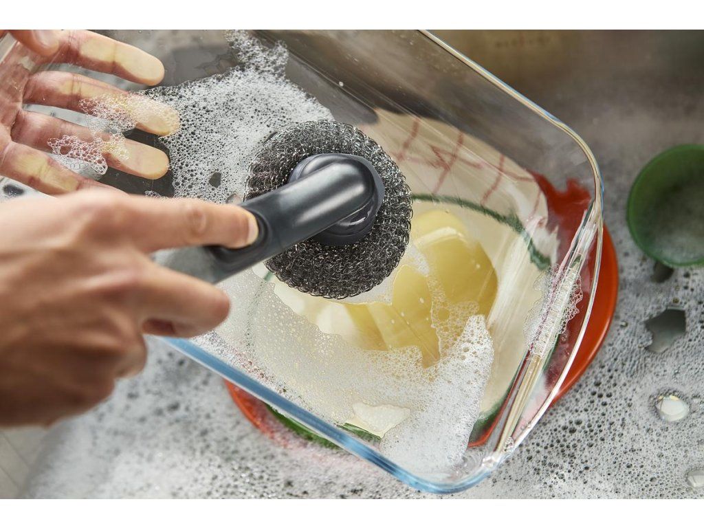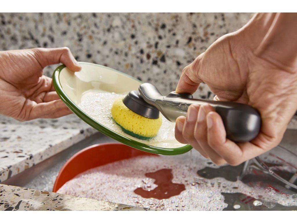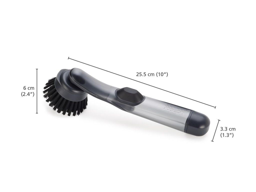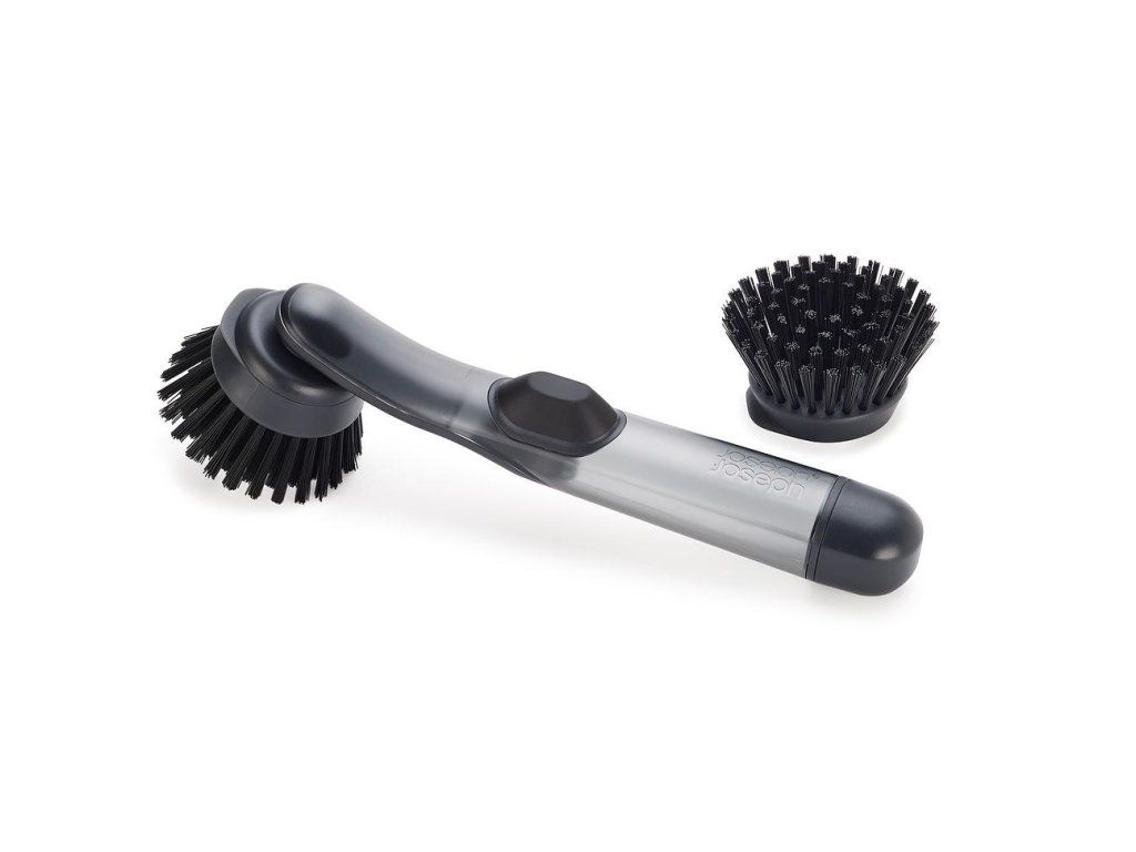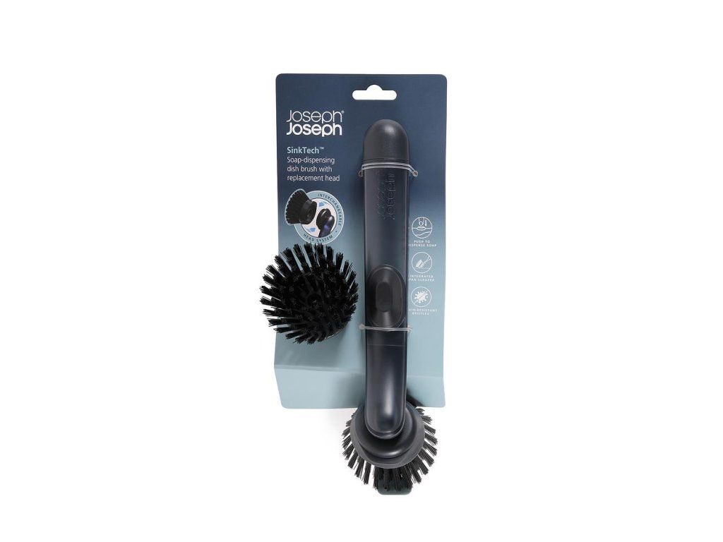 Kartáč na nádobí JOSEPH JOSEPH SinkTech 6500018 se zásobník mýdla/saponátu. Dávkování se provádí jednoduchým stiskem tlačítka. Kartáč má odolné štětiny pro efektivní čištění, integrovanou škrabku na pánve a je dodáván s jednou náhradní hlavicí. Výměna hlavice se provádí jednoduchým odšroubováním. Další příslušenství je k objednání samostatně.