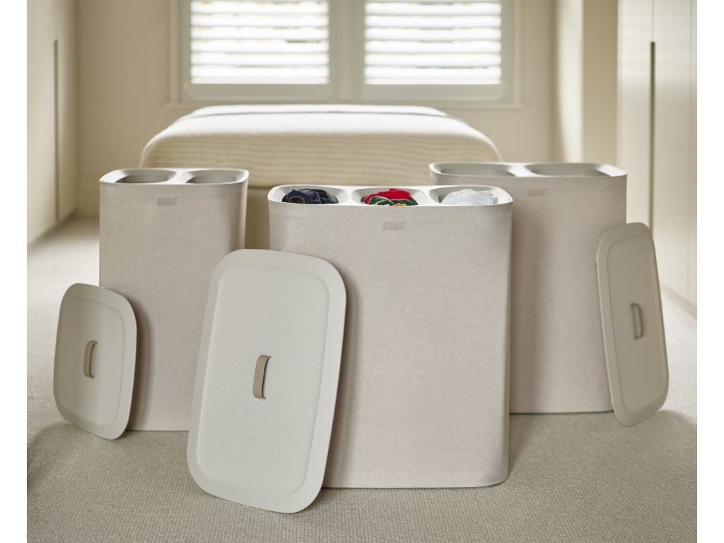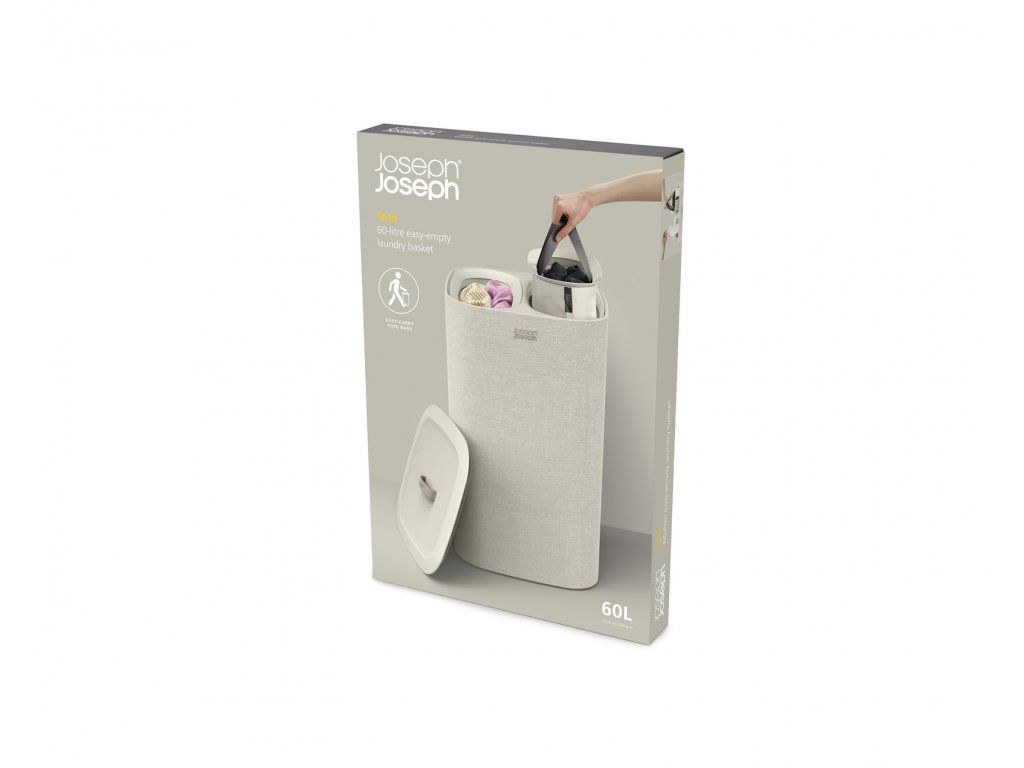 Koš na prádlo JOSEPH JOSEPH Tota umožňuje předběžné třídění prádla do dvou snadno vyjmutelných pytlů (každý o objemu 30l). Pytle mají madla pro pohodlné přenášení do prádelny. Na spodní straně pytlů jsou úchytky usnadňující jejich vyprázdnění. Po vyprázdnění pytle snadno a rychle vložíte zpět do korpusu koše. Elegantní koš můžete umístit do ložnice, koupelny nebo komory. Koše Tota jsou dodávány rozložené, zabalené v plochých kartonech. Konstrukce koše sestává ze spodní a vrchní plastové základny, které jsou spojeny tyčemi s předpínacím mechanismem vnějšího obvodového textilního pláště. Koše se uzavírají volně položeným plastovým víkem.