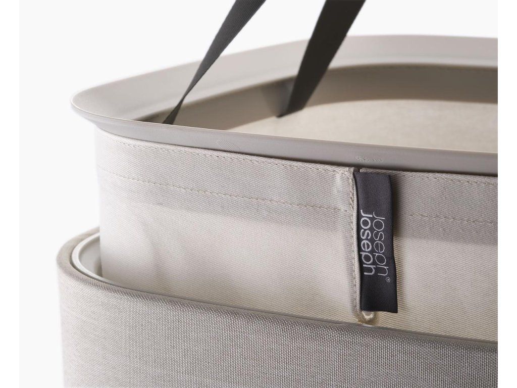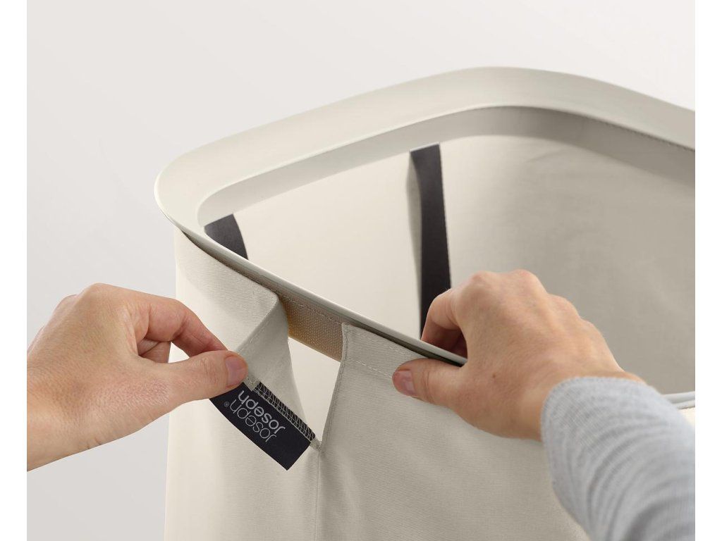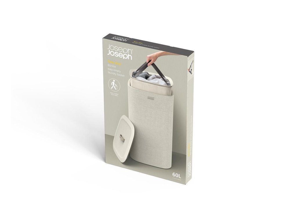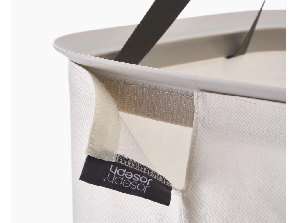 Koš na prádlo JOSEPH JOSEPH Tota se snadno vyjmutelným pytlem a madly pro pohodlné přenášení do prádelny. Na spodní straně pytle jsou úchytky usnadňující jeho vyprázdnění. Po vyprázdnění pytel snadno a rychle vložíte zpět do korpusu koše. Elegantní koš můžete umístit do ložnice, koupelny nebo komory. Koše Tota jsou dodávány rozložené, zabalené v plochých kartonech. Konstrukce koše sestává ze spodní a vrchní plastové základny, které jsou spojeny tyčemi s předpínacím mechanismem vnějšího obvodového textilního pláště. Koše se uzavírají volně položeným plastovým víkem.