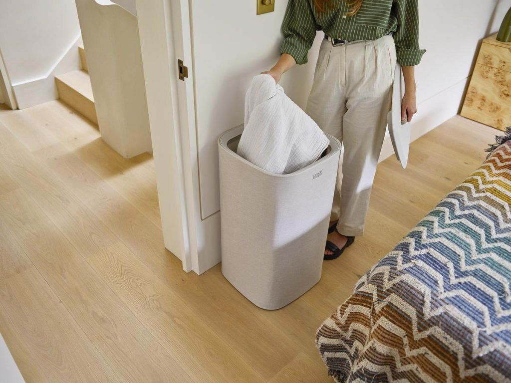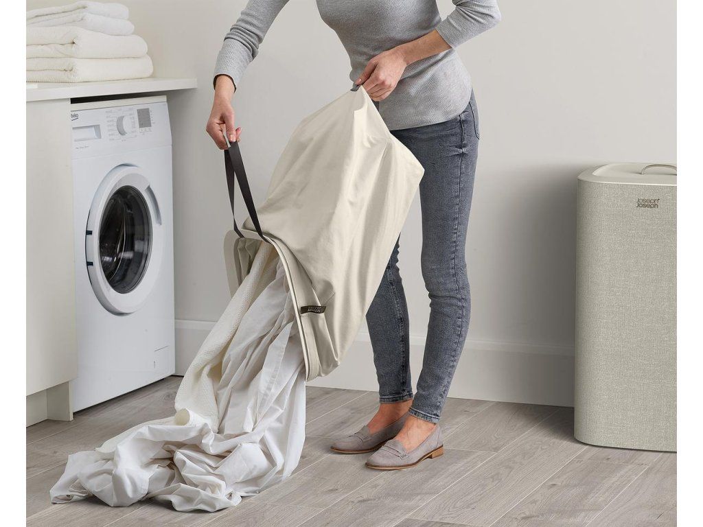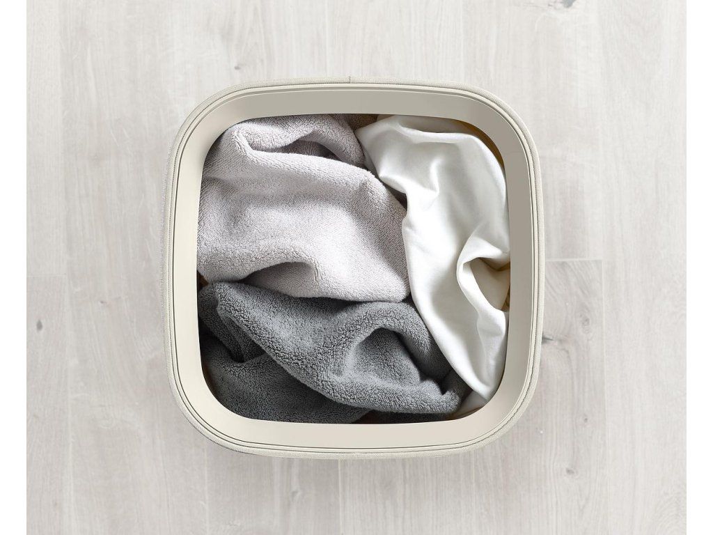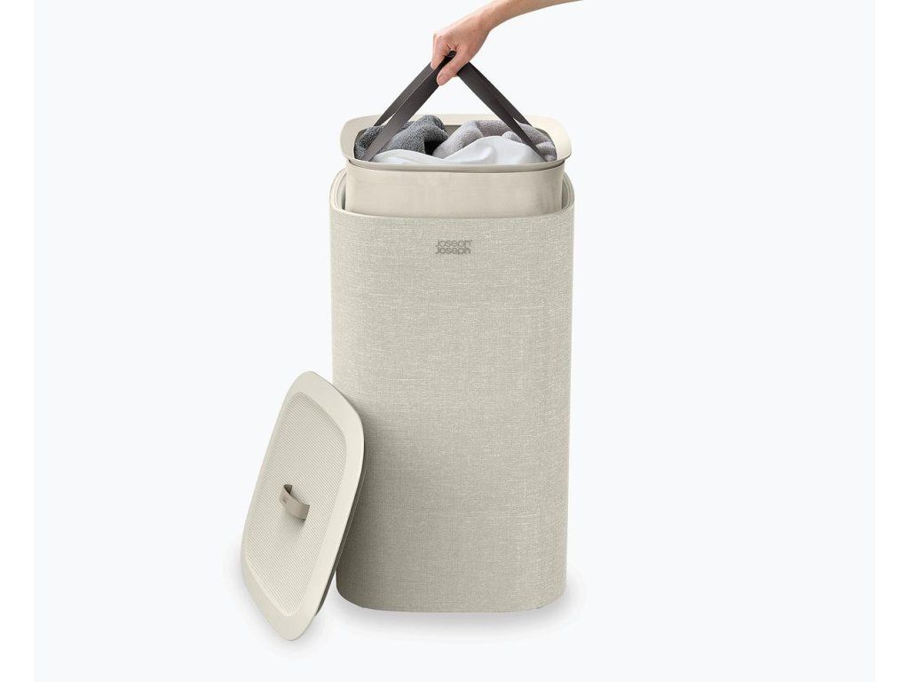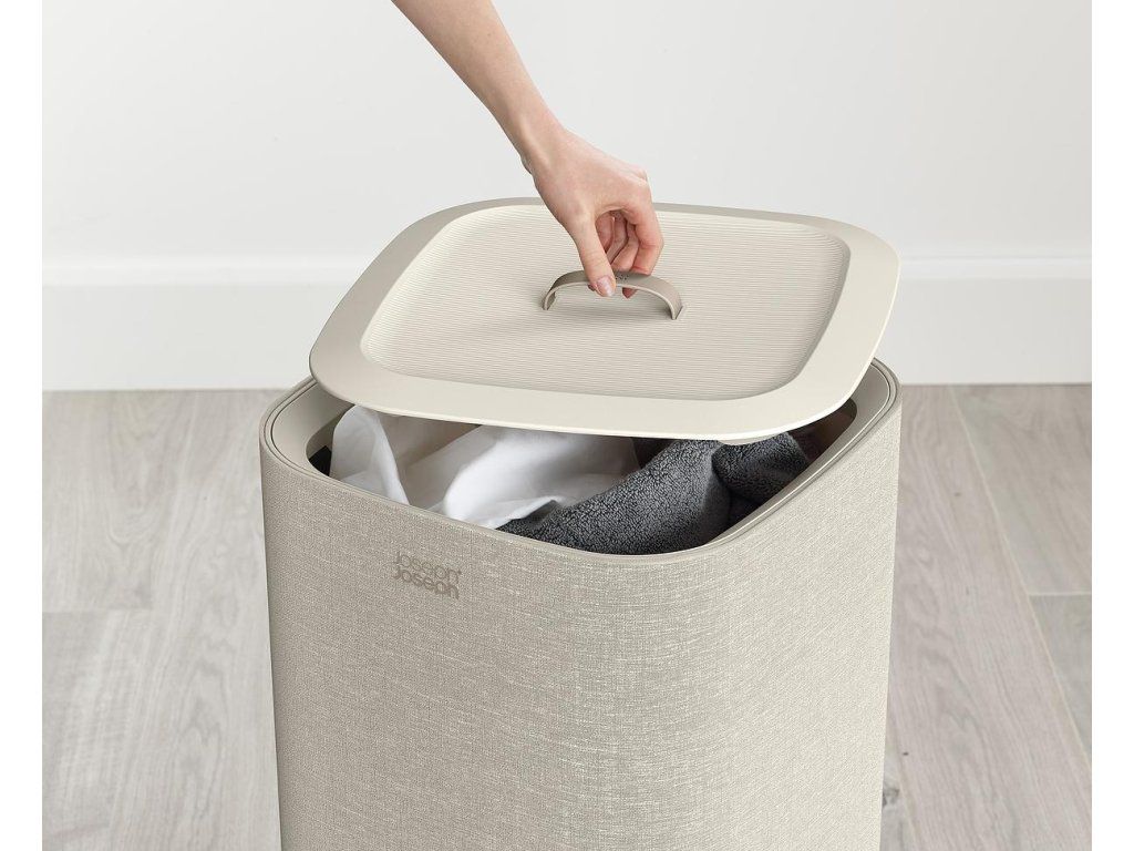 Koš na prádlo JOSEPH JOSEPH Tota se snadno vyjmutelným pytlem a madly pro pohodlné přenášení do prádelny. Na spodní straně pytle jsou úchytky usnadňující jeho vyprázdnění. Po vyprázdnění pytel snadno a rychle vložíte zpět do korpusu koše. Elegantní koš můžete umístit do ložnice, koupelny nebo komory. Koše Tota jsou dodávány rozložené, zabalené v plochých kartonech. Konstrukce koše sestává ze spodní a vrchní plastové základny, které jsou spojeny tyčemi s předpínacím mechanismem vnějšího obvodového textilního pláště. Koše se uzavírají volně položeným plastovým víkem.