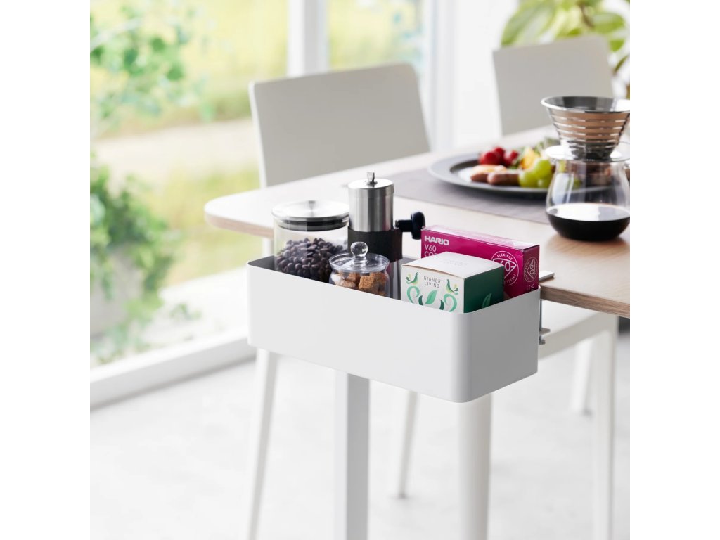 Kovový organizér k upevnění ke stolové desce pomocí nastavitelných šroubů - YAMAZAKI Tower 1572. Nabízí pohodlné úložiště pro malé předměty. Ve spodní části má mezeru pro vedení kabelů nabíječek. Velikost: 9,5 x 30 x 15 cm (VxŠxH) / nosnost: 5 kg.