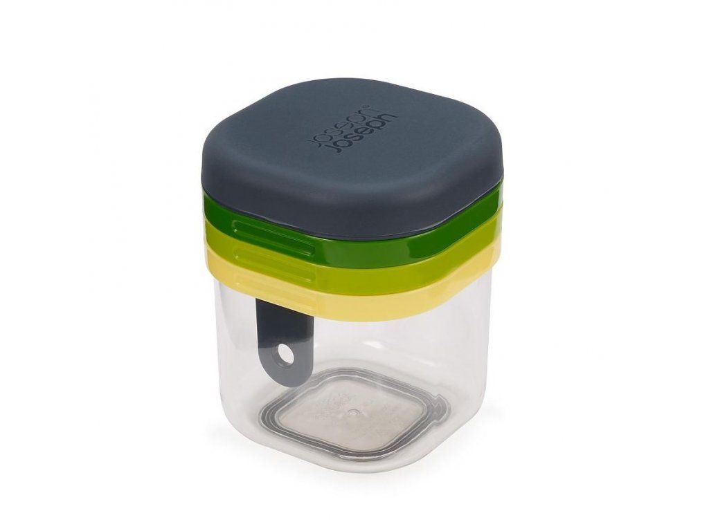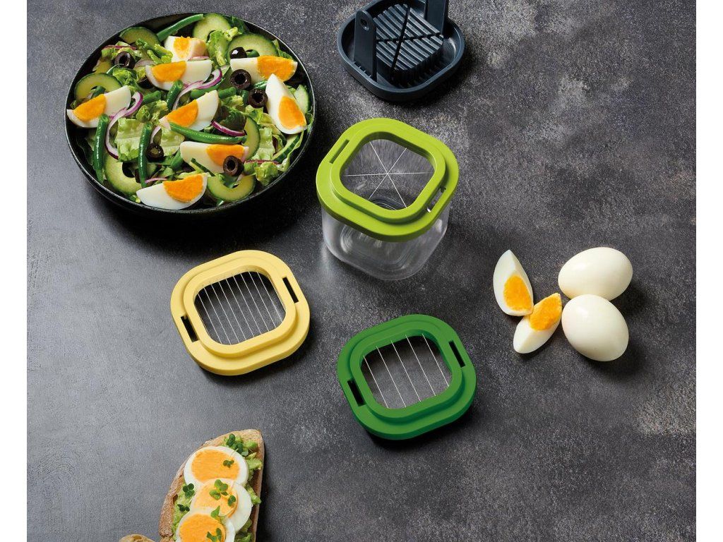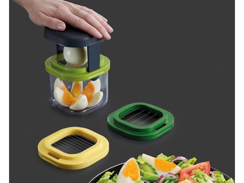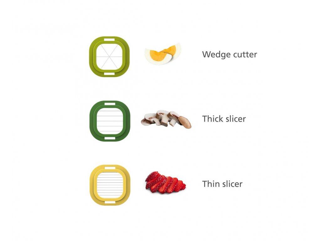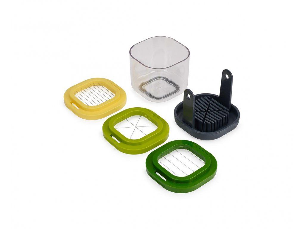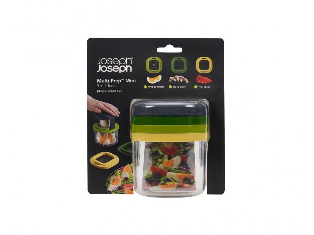 Ruční mini kráječ JOSEPH JOSEPH Multi-Prep Mini 20231 pro krájení vajec, měkkého ovoce a hub. Sada obsahuje tři řezné nástroje z nerezové oceli umožňující krájení na klínky a tenké a tlusté proužky. Ve spodní části sady je průhledný zásobník s protiskluzovou základnou. Pro snadné skladování lze celou sadu složit do kompaktního, prostorově úsporného tvaru. Velikost: 12,2 x 9,6 x 9,6 cm (VxŠxH).