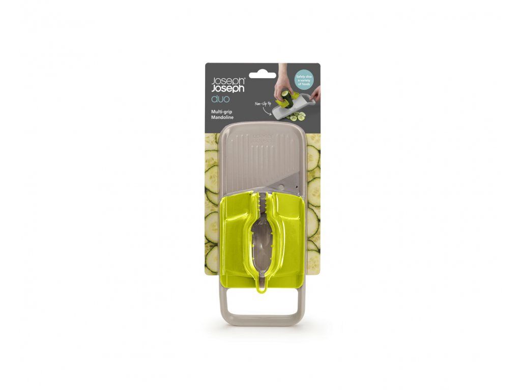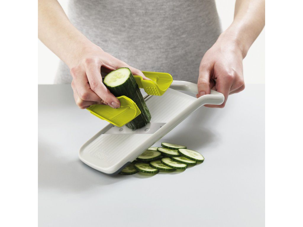 Kráječ na zeleninu JOSEPH JOSEPH Duo Multi-Grip Mandoline s inovativním držákem krájených potravin. Precizní tvar držáku zajišťuje bezpečné plátkování malých i velkých kousků. Nejmenší klěštičkový držák užijete při plátkování ředkviček nebo česneku. Střední držák je vhodný na plátkování mrkví a okurek. S plochým držákem pak vytváříte dlouhé plátky z cuket a lilků. Výrobek lze mýt v myčce.