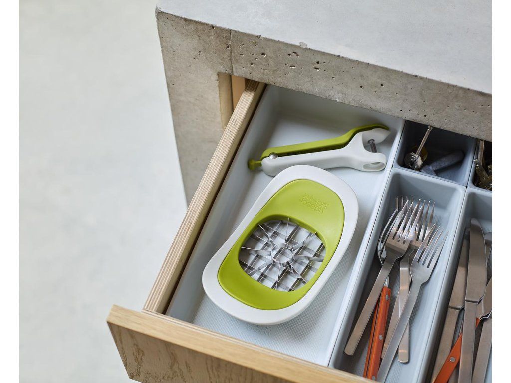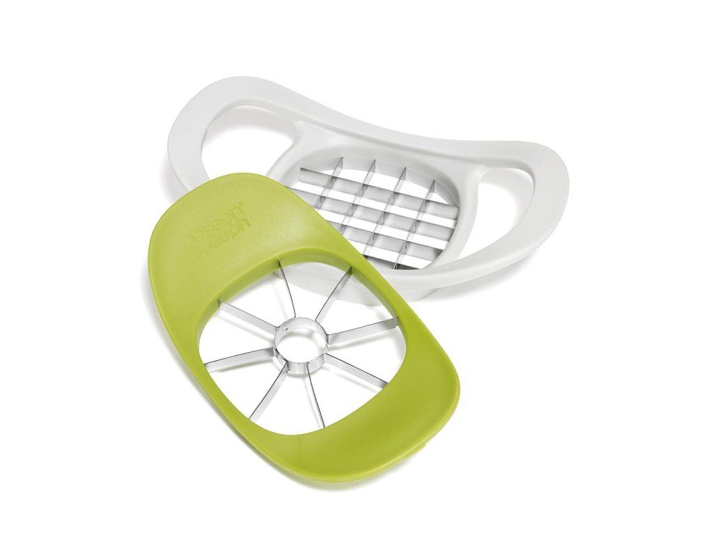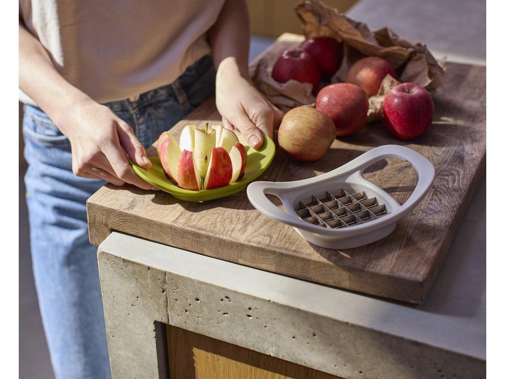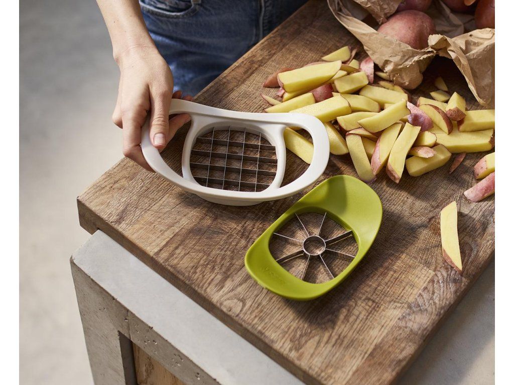 Dva krájecí nástroje kompaktně vložené do sebe. Určeny pro odstraňování jádřinců z jablek a krájení brambor. Kráječe mají ostré nerezové čepele. Vkládací design šetřící místo v zásuvce.