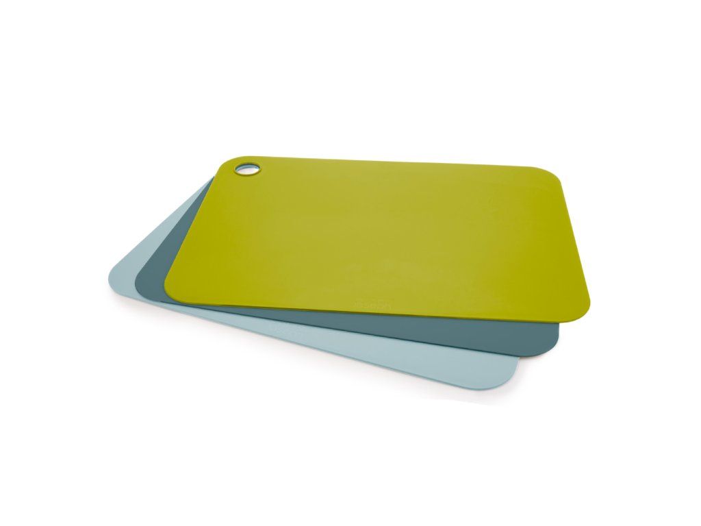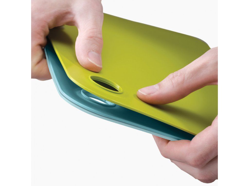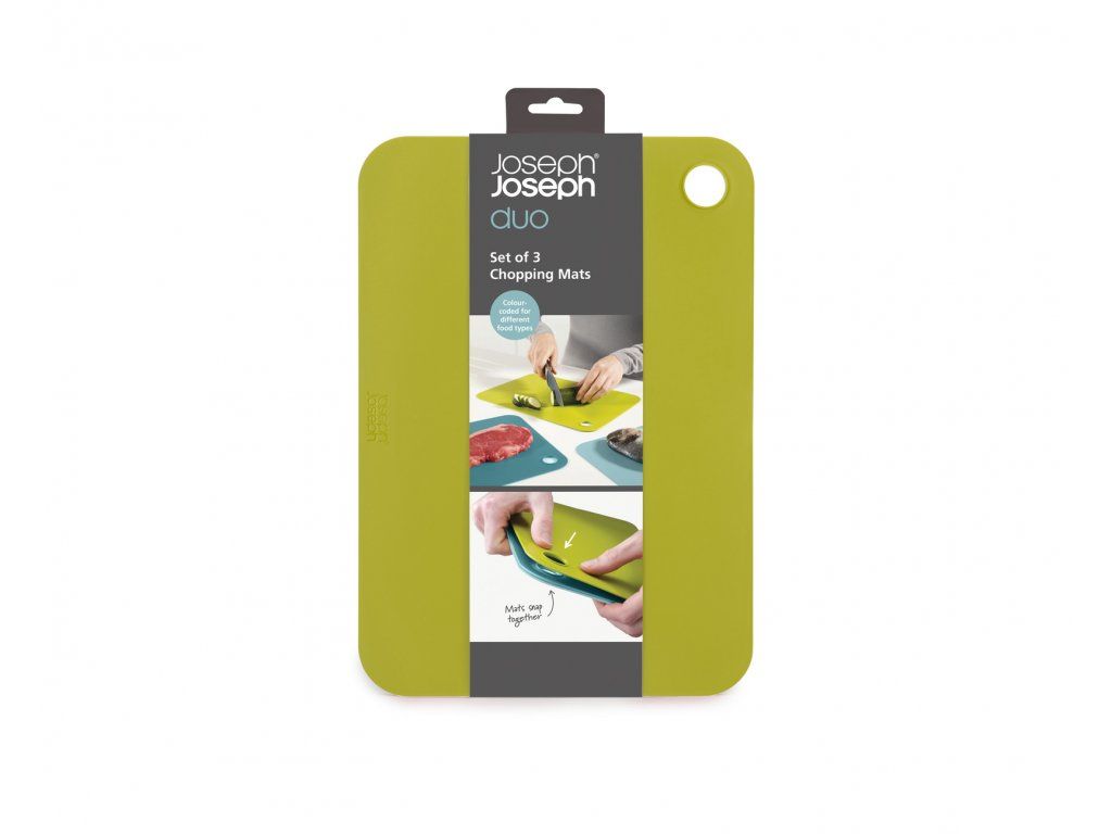 Sada 3 plastových krájecích podložek JOSEPH JOSEPH Duo pro oddělené krájení zeleniny, masa a vařených potravin. Otvor je tvarován jako klip umožňující spojení podložek k sobě. Prkénka lze mýt v myčce do teploty 50°C. Doporučeno je ruční mytí. Velikost: 0,6 x 24 x34 cm.