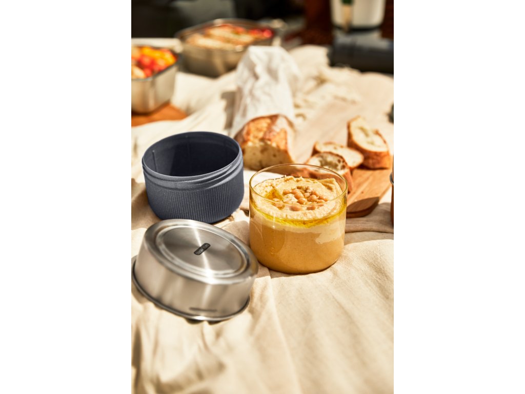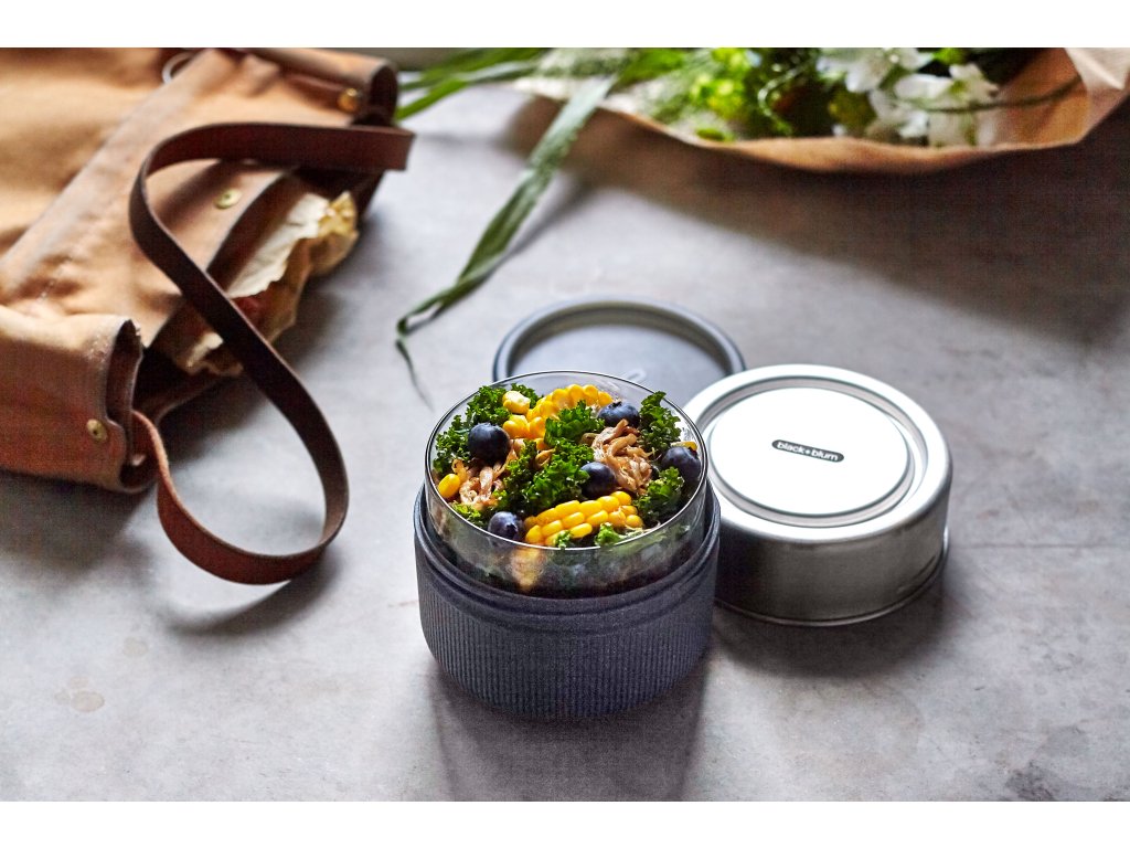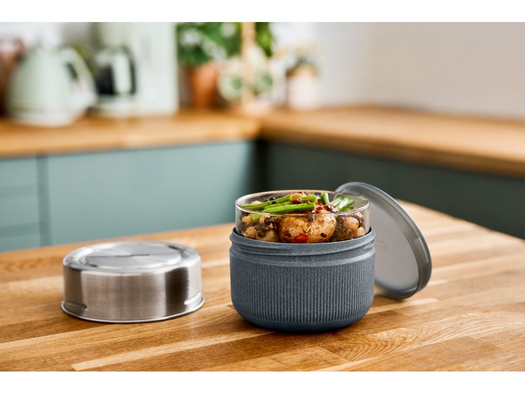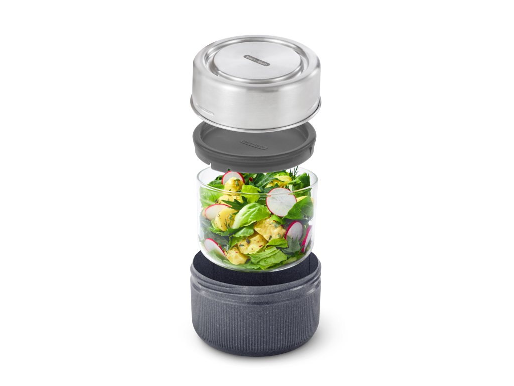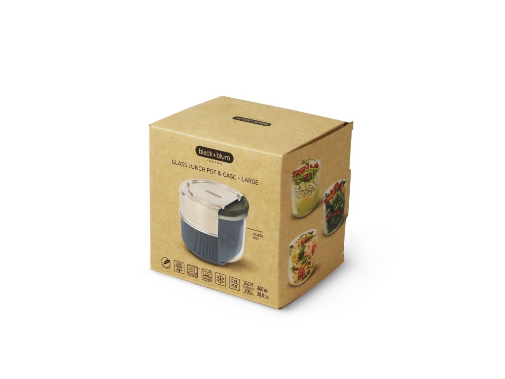 Nosíte si oběd do práce a hledáte užitečnou náhradu za plastové boxy? BLACK+BLUM Glass Lunch Bowl/Pot jsou cestovní sady na lehké polední jídlo s vnitřní skleněnou miskou. Vnitřní miska z borosilikátového skla je uzavíratelná těsnícím silikonovým víčkem (100% nepropustná). Vnější tepelně izolující obal chrání skleněnou misku proti rozbití. Jeho spodní část je vyrobena z polypropylenu s dřevovláknitou příměsí (ve dvou barevných provedeních), vrchní šroubovací díl je nerezový.