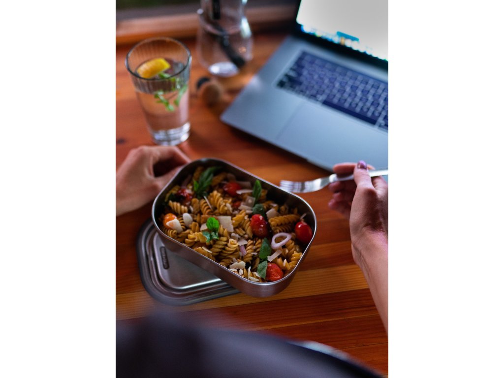 Perfektně těsnící nerezová nádoba o objemu 1l, ideální k přepravě svačin a lehkých poledních jídel. Součástí balení je vidlička a nastavitelná vnitřní přepážka. Misku bez víčka můžete využít i k přípravě jídel v troubě, misku včetně víčka pak k uskladnění jídel v lednici. Nerezový lunchbox není určen k ohřevu v mikrovlnné troubě. Nádobka je vyrobena z kvalitní oceli 304/18-8. Těsnění, vzduchový ventil a stahovací pásek jsou ze silikonové gumy. Lunchbox je dodáván včetně nerezové vidličky a odnímatelné vnitřní dělící příčky. Silikonový ventilek ve víčku nádobky usnadňuje její otevření. Ventilkem vpustíte do nádobky s přisátým víčkem vzduch. Nádobku pak opatrně (pozor na tekutý obsah) otevřete tahem za okraj víčka.