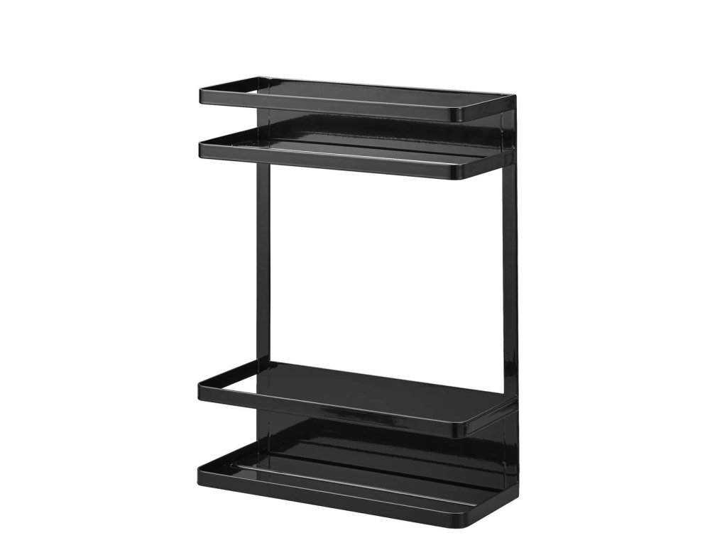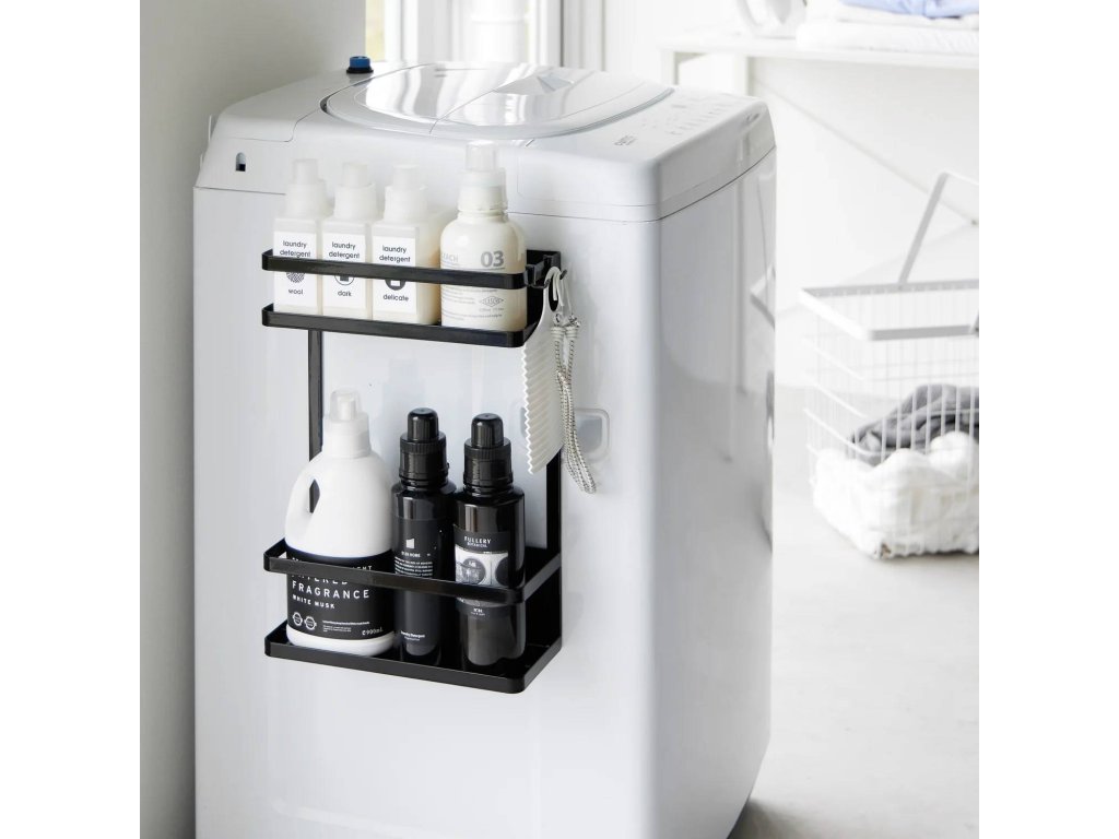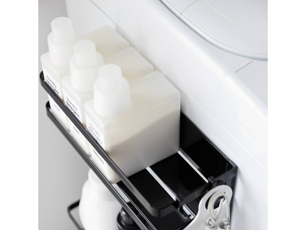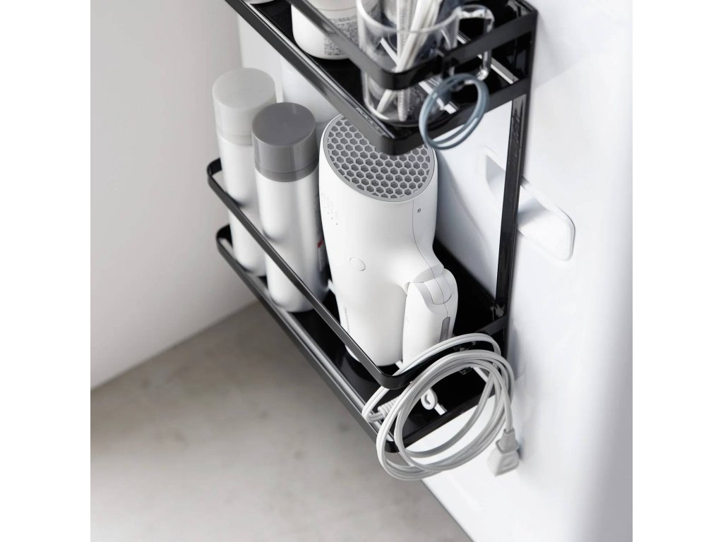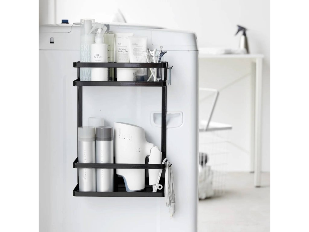 Dvoupatrový závěsný organizér s magnetickým uchycením YAMAZAKI Tower 1800 (bílý) / 1801 (černý). Kovový organizér se magneticky připevňuje na pračku nebo jiný kovový povrch. Ve dvou patrech nabízí prostor pro prací prostředky, náplňové sáčky apod. Součástí balení jsou 2 háčky pro dodatečné zavěšení malých předmětů.