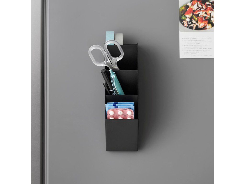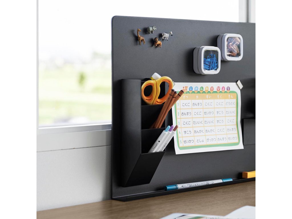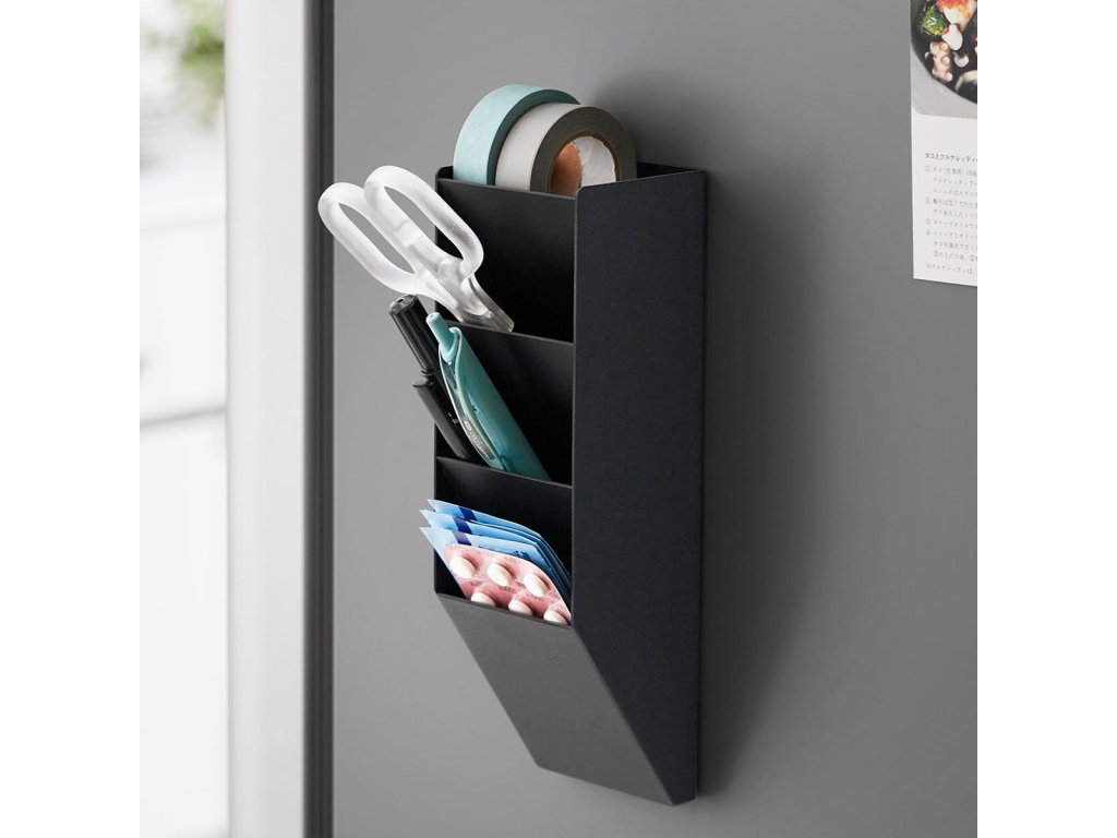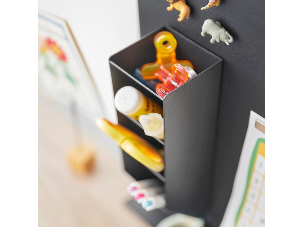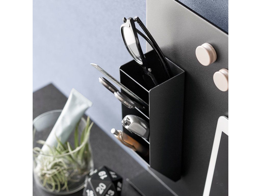 Magnetický organizér YAMAZAKI Tower 10096 (bílý) / 10097 (černý) dodávaný jako doplněk k magnetickému panelu 10066 / 10067. Lze užít i samostatně. Kovový organizér s magnetickou zadní stranou poskytuje praktický úložný prostor pro tužky, nůžky a jiné kancelářské potřeby.