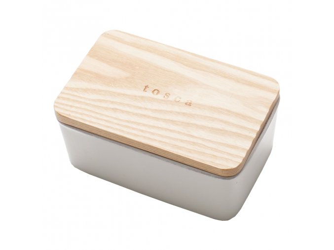 Keramická máselnička YAMAZAKI Tosca 3098. Dřevěné víčko. Velikost: 7 x 15,3 x 9,8 cm (VxŠxH).