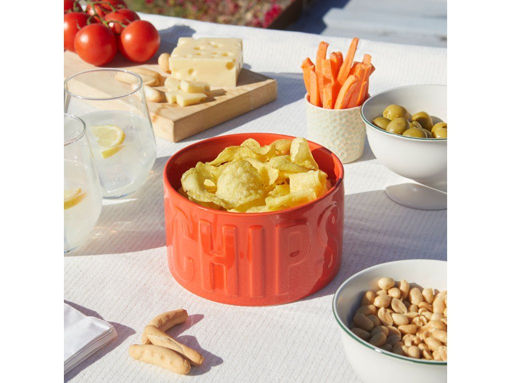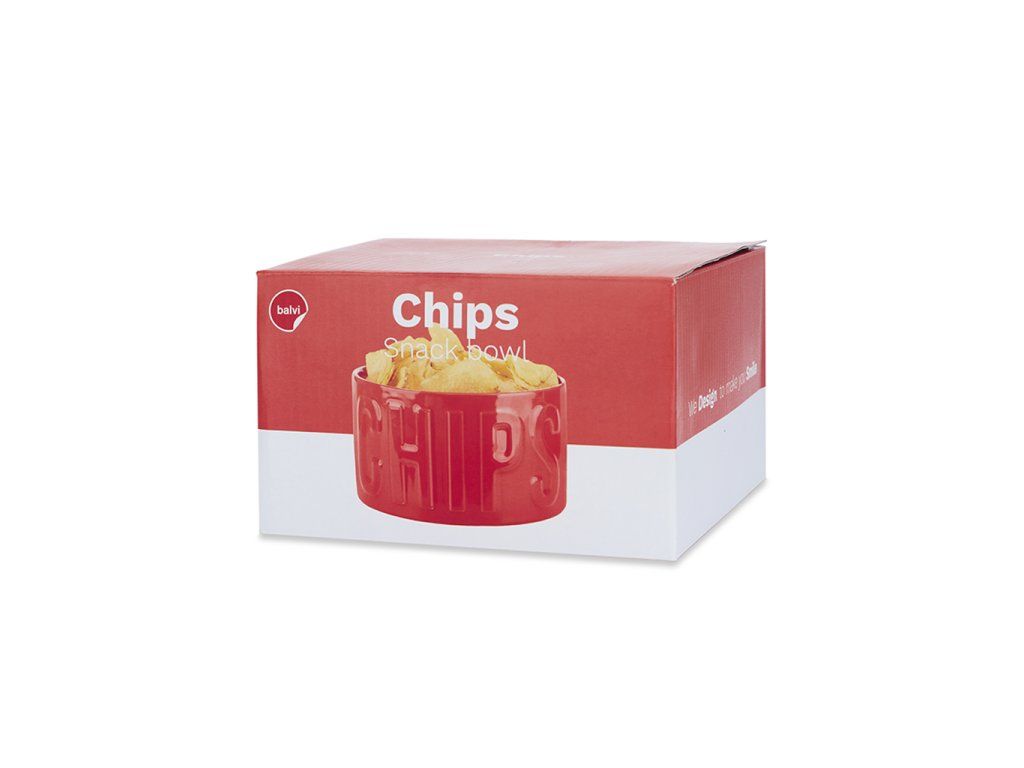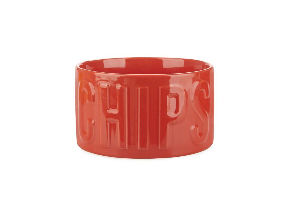 Keramická mísa na chipsy BALVI Chips. Reliéfní nápis. Lze mýt v myčce a použít pro ohřev v mikrovlnné troubě. Velikost: 8,5 x 15 x 15 cm (VxŠxH).