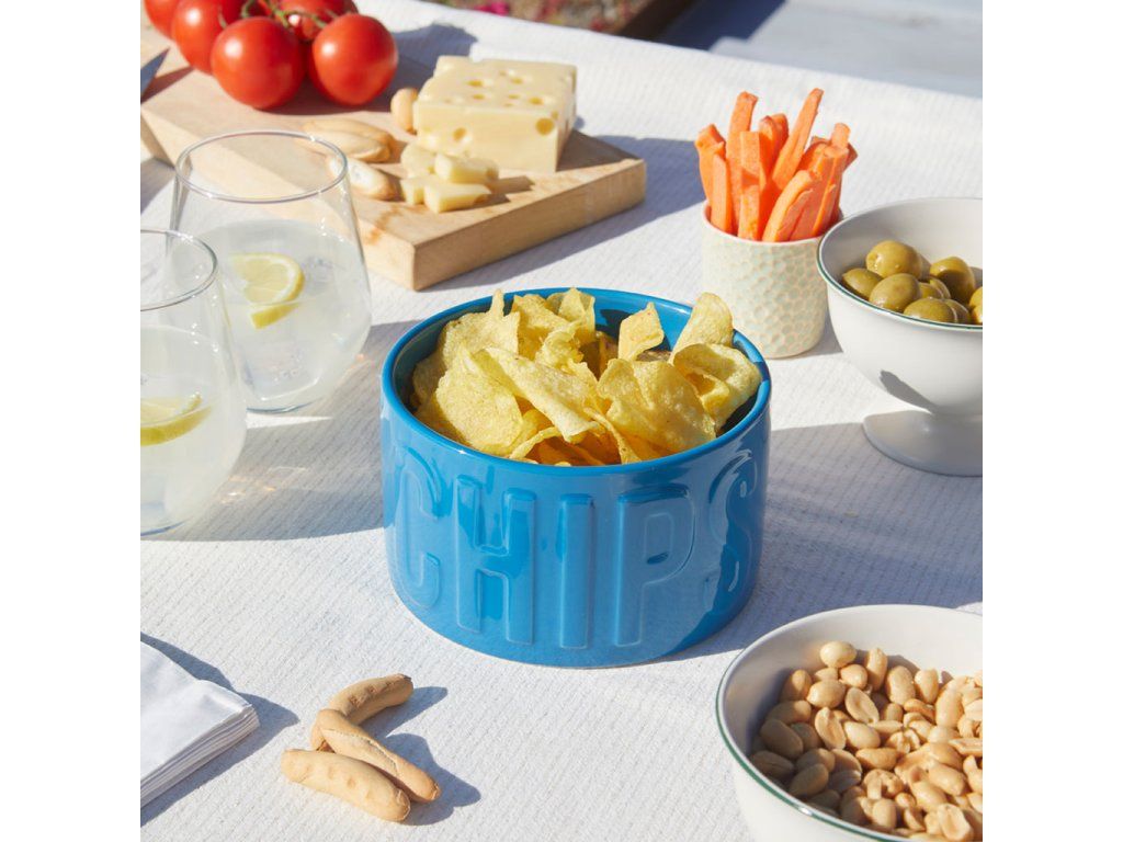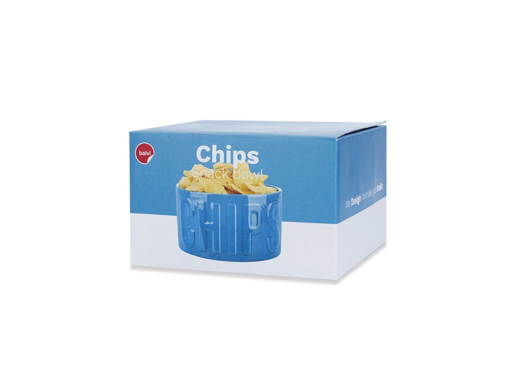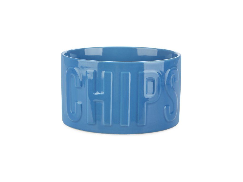 Keramická mísa na chipsy BALVI Chips. Reliéfní nápis. Lze mýt v myčce a použít pro ohřev v mikrovlnné troubě. Velikost: 8,5 x 15 x 15 cm (VxŠxH).