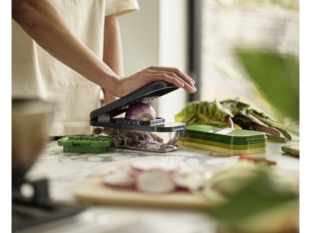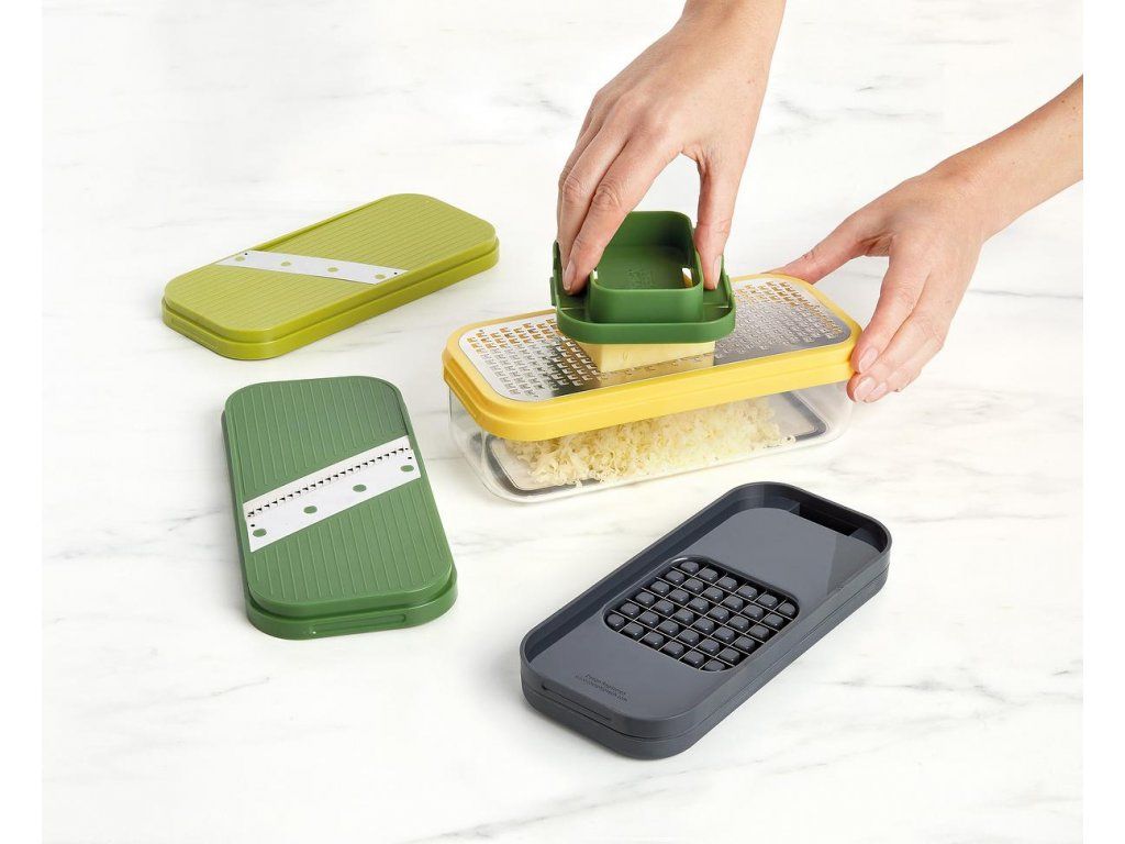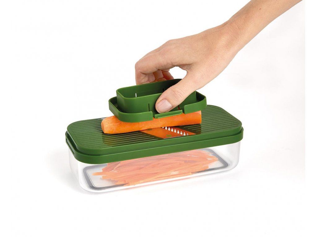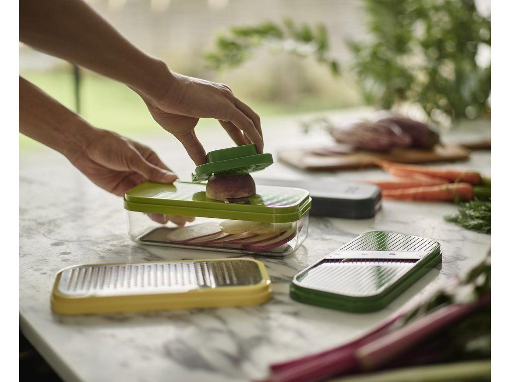 Kompaktní multifunkční kráječ/struhadlo JOSEPH JOSEPH Multi-Prep 20222. Obsahuje čtyři vyměnitelné čepele pro různé úkoly – sekáček (ideální pro rychlé porcování cibule a pro snadnou přípravu hranolků z brambor/mrkve/cukety), struhadlo a kráječ na principu mandolína s rovným břitem a břitem julienne pro krájení jemných nudliček. Pro práci se struhadlem a kráječi je k dispozici bezpečný držák. Ve spodní části sady je průhledný zásobník s protiskluzovou základnou. Pro snadné skladování lze celou sadu složit do kompaktního, prostorově úsporného tvaru. Velikost: 15 x 21,6 x 9,8 cm (VxŠxH).