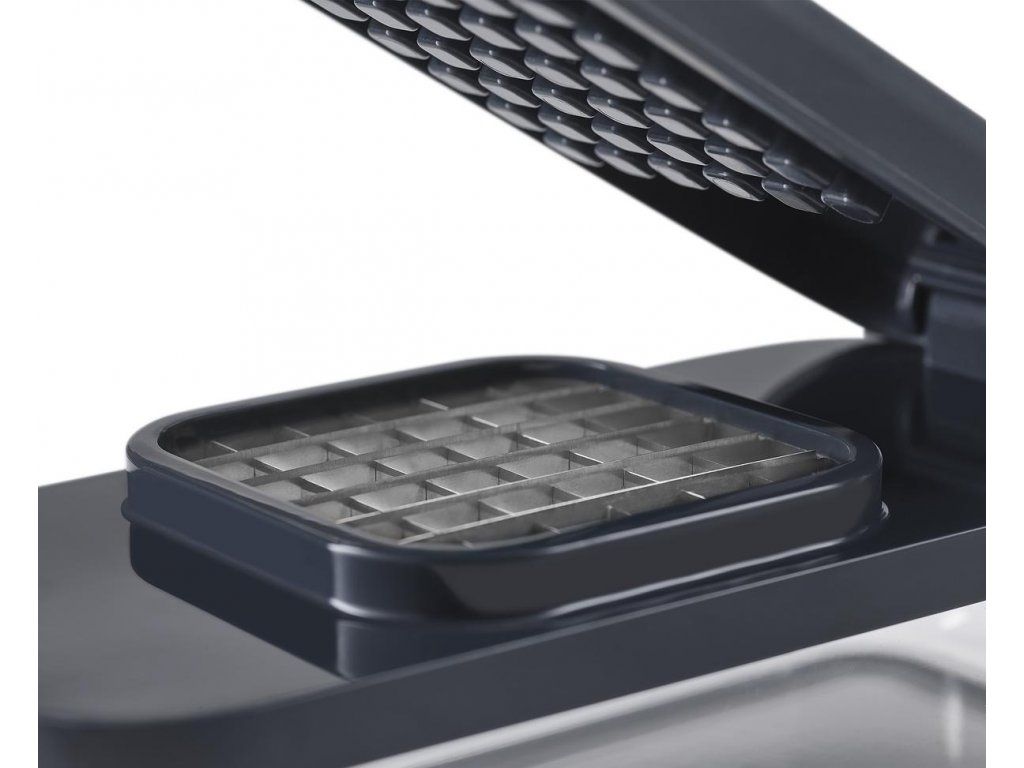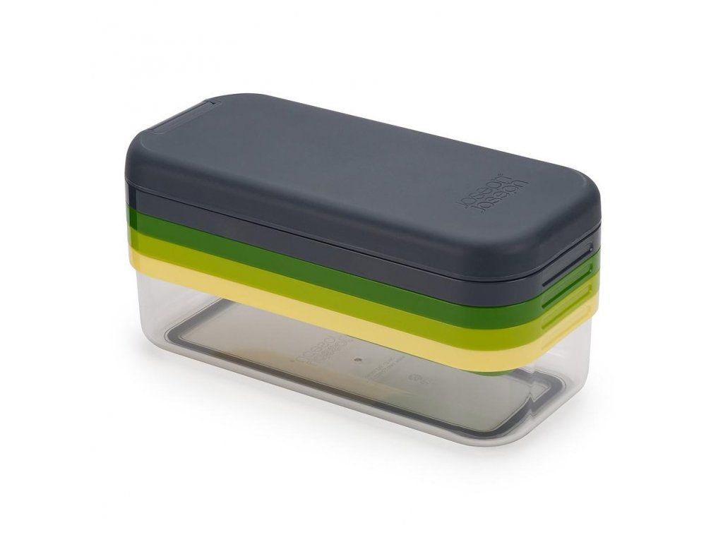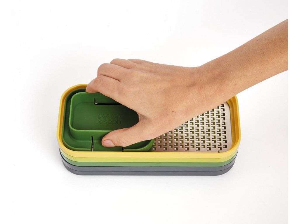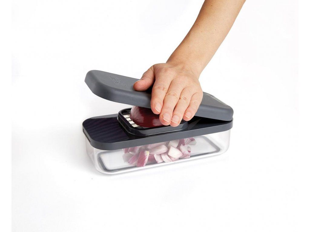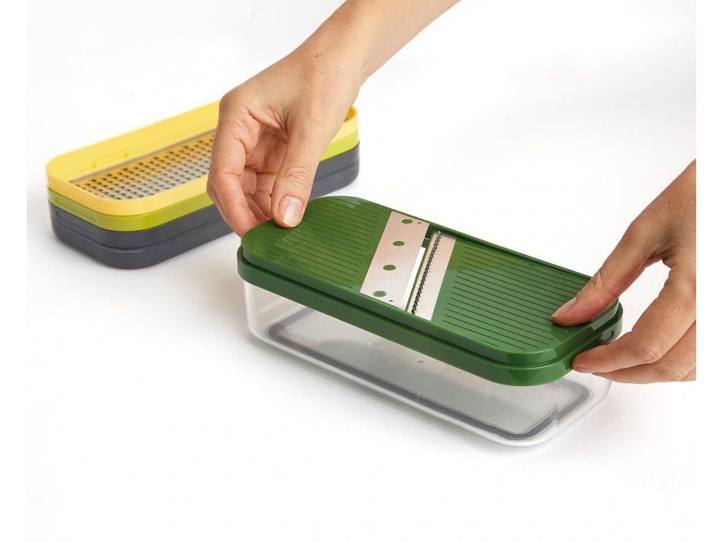 Kompaktní multifunkční kráječ/struhadlo JOSEPH JOSEPH Multi-Prep 20222. Obsahuje čtyři vyměnitelné čepele pro různé úkoly – sekáček (ideální pro rychlé porcování cibule a pro snadnou přípravu hranolků z brambor/mrkve/cukety), struhadlo a kráječ na principu mandolína s rovným břitem a břitem julienne pro krájení jemných nudliček. Pro práci se struhadlem a kráječi je k dispozici bezpečný držák. Ve spodní části sady je průhledný zásobník s protiskluzovou základnou. Pro snadné skladování lze celou sadu složit do kompaktního, prostorově úsporného tvaru. Velikost: 15 x 21,6 x 9,8 cm (VxŠxH).