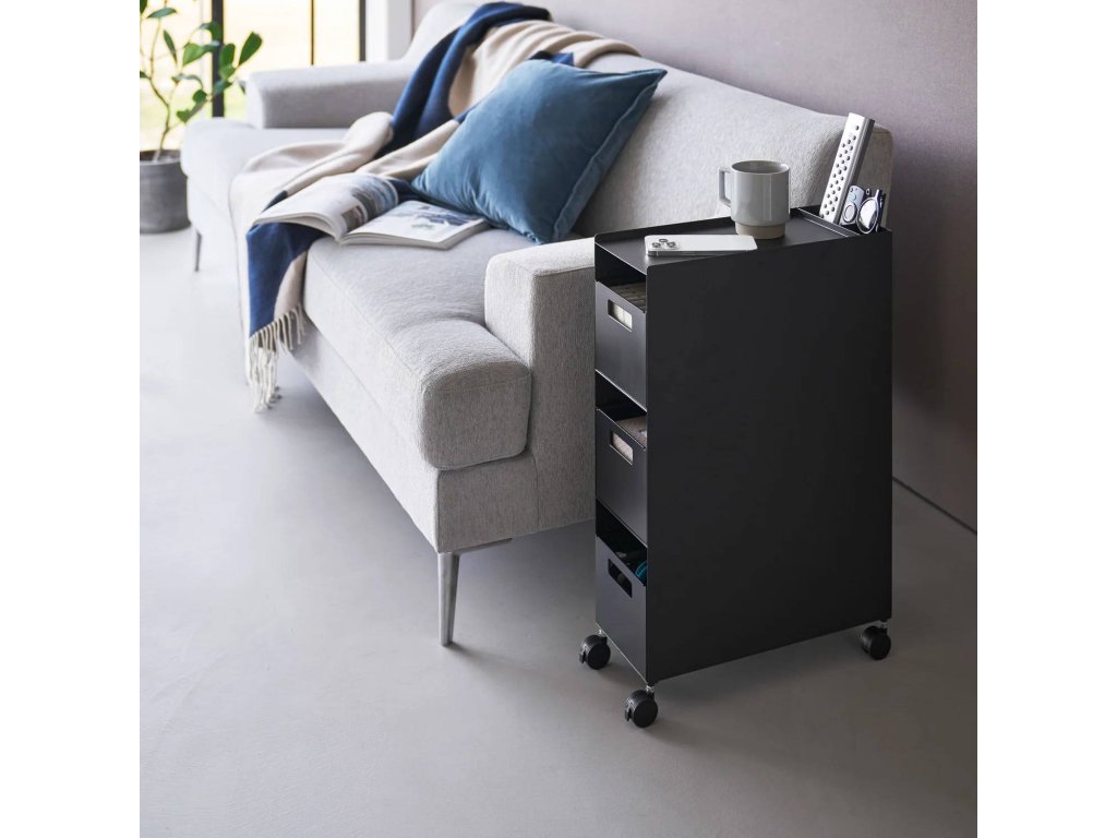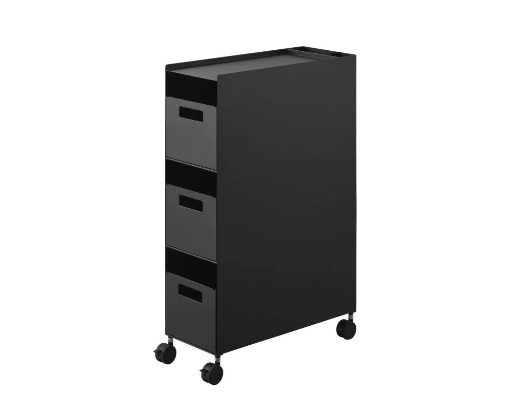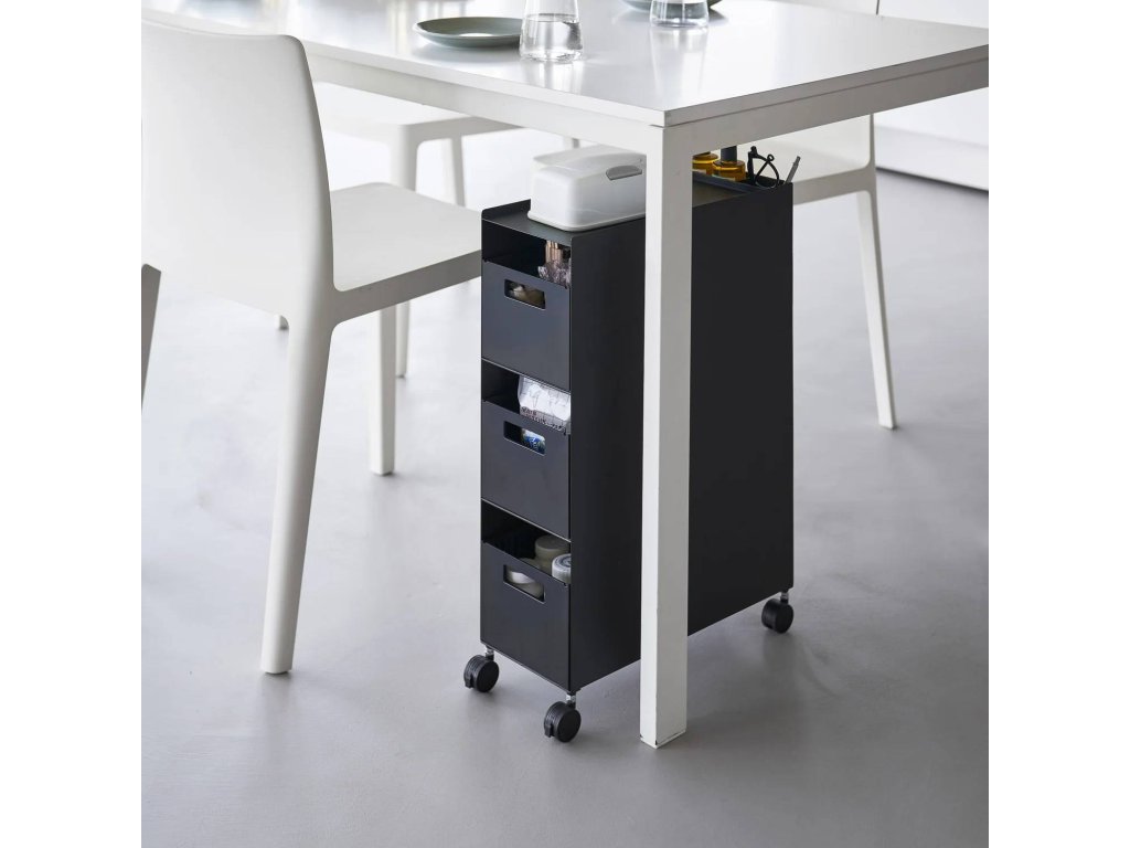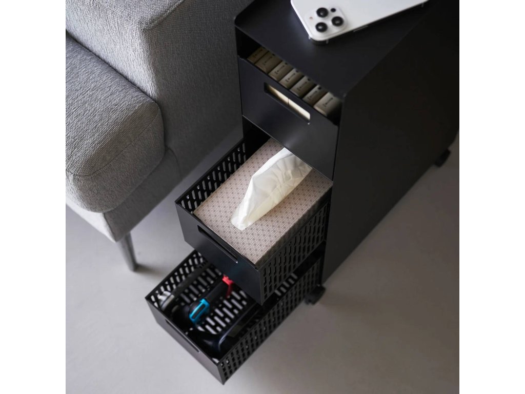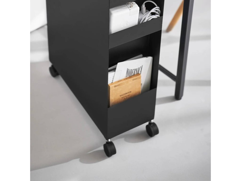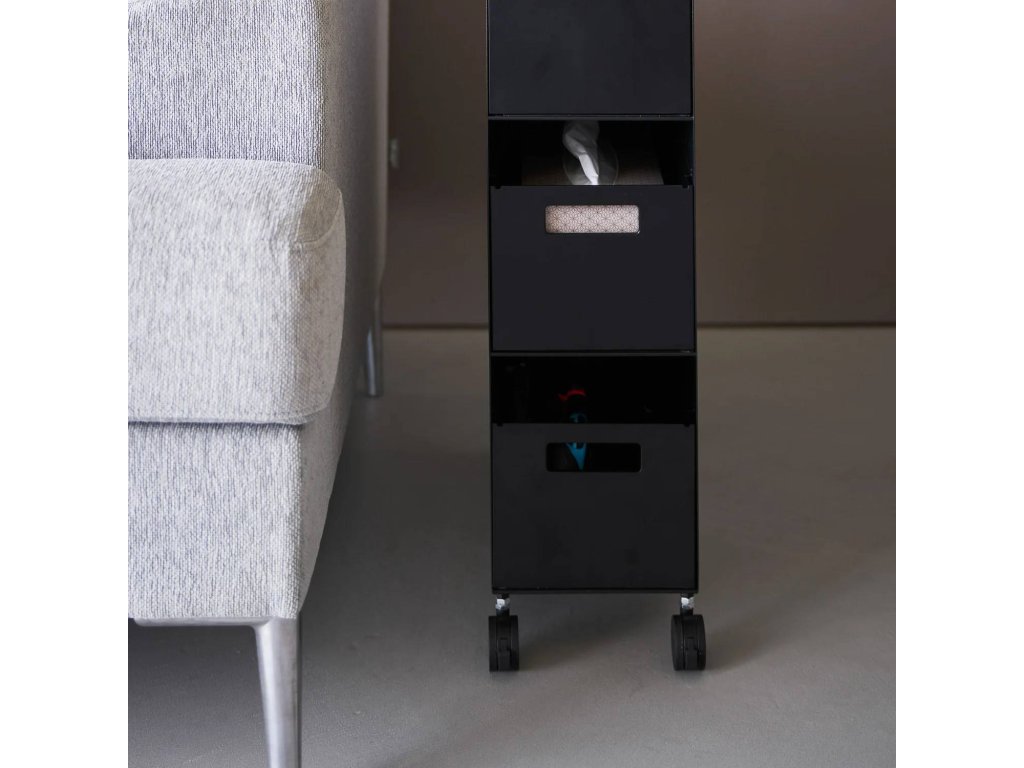 Všestranný pojízdný úložný vozík se třemi koši YAMAZAKI Tower 10015 (bílý) / 10016 (černý). Vozík nabízí tři úrovně úložného prostoru se třemi koši vybavenými flexibilními přepážkami. Další úložný prostor je k dispozici ve dvou zadních přihrádkách.