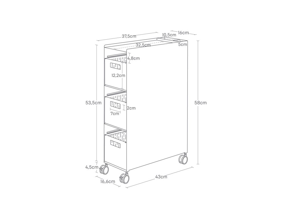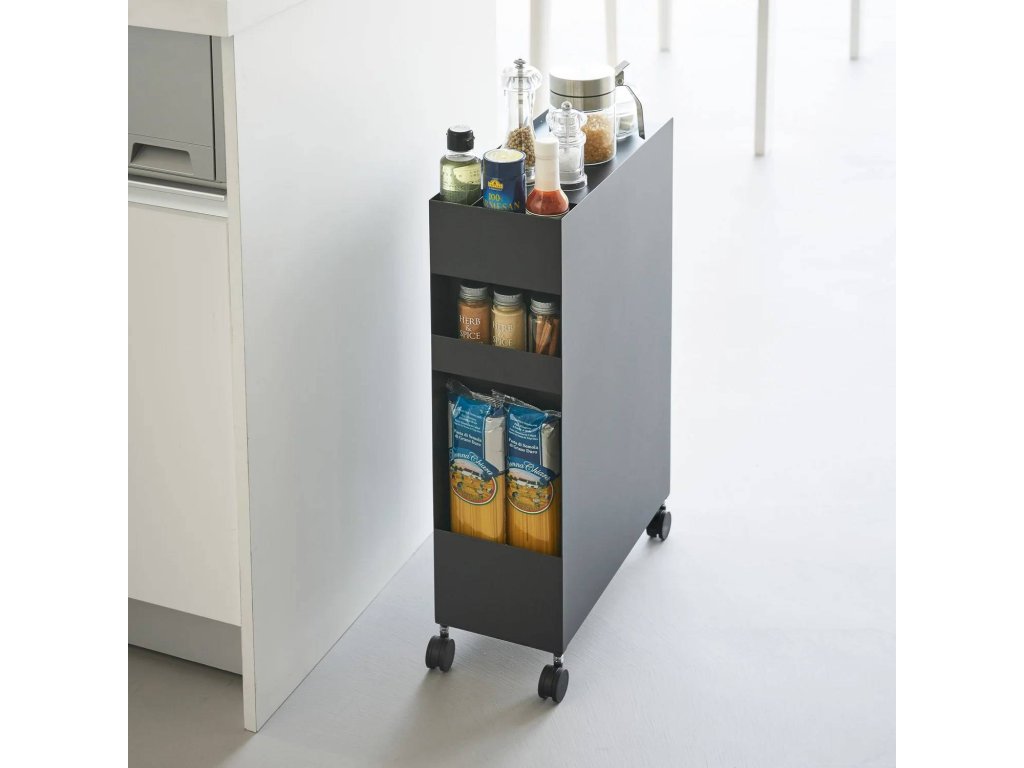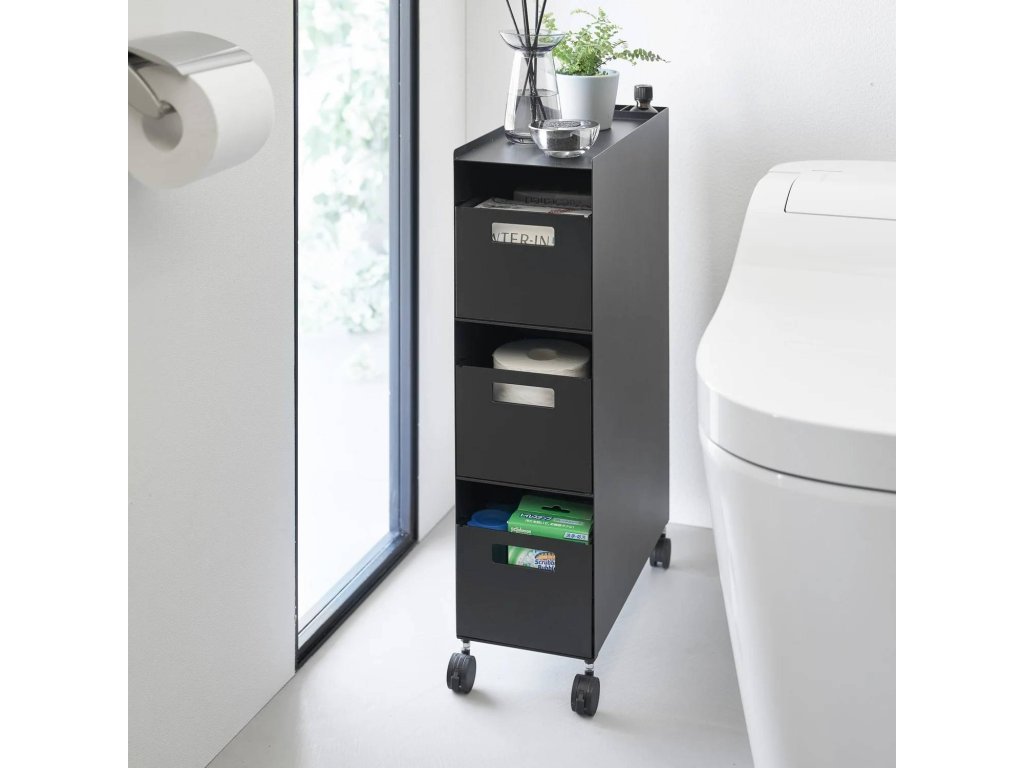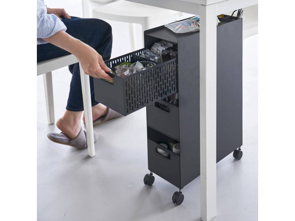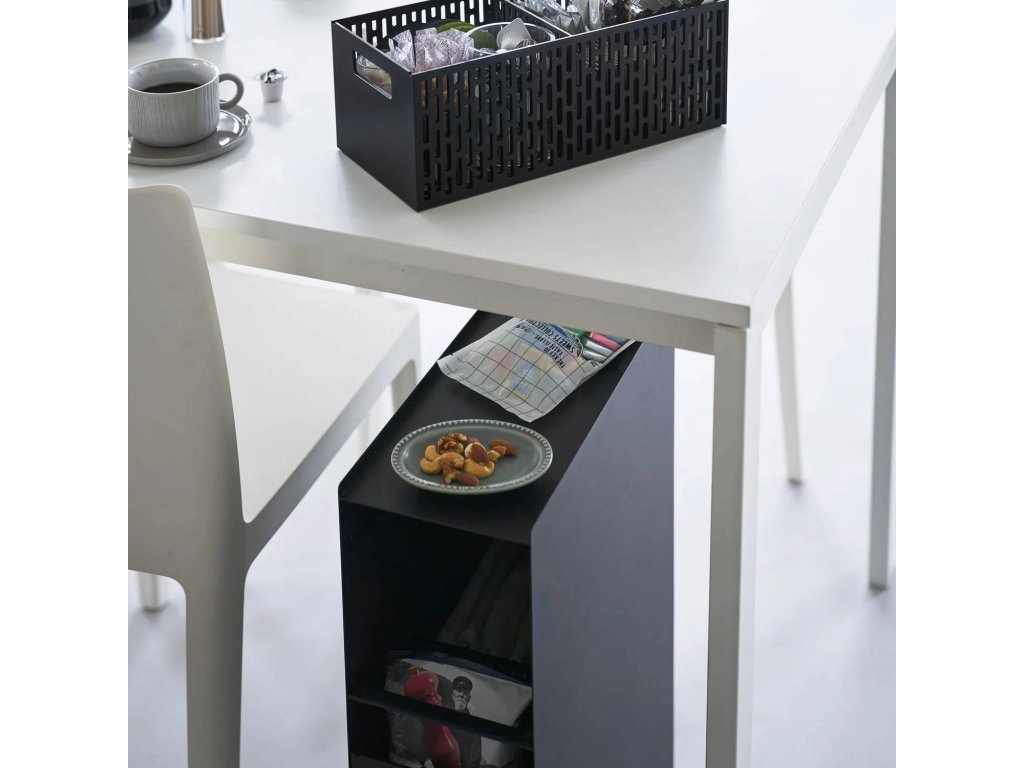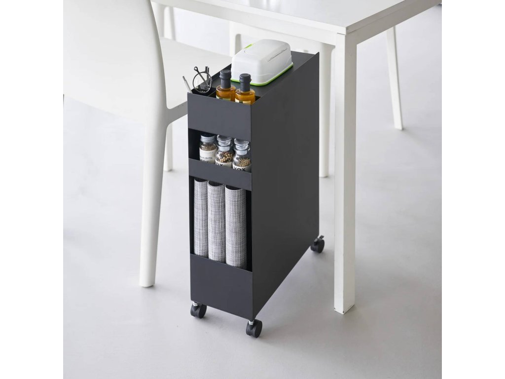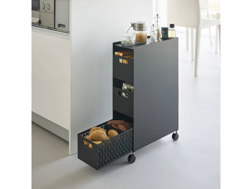 Všestranný pojízdný úložný vozík se třemi koši YAMAZAKI Tower 10015 (bílý) / 10016 (černý). Vozík nabízí tři úrovně úložného prostoru se třemi koši vybavenými flexibilními přepážkami. Další úložný prostor je k dispozici ve dvou zadních přihrádkách.