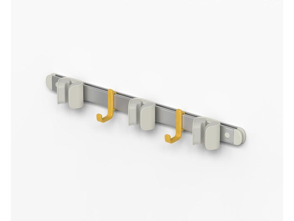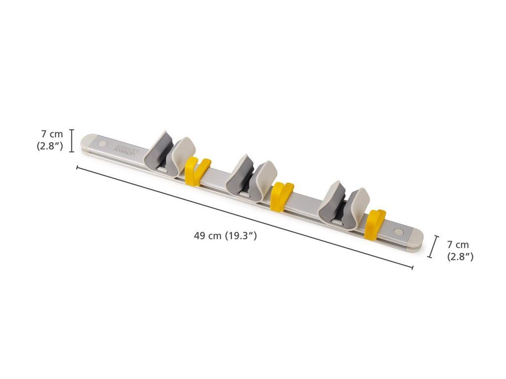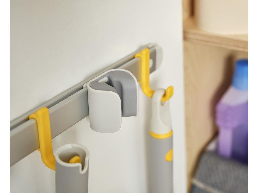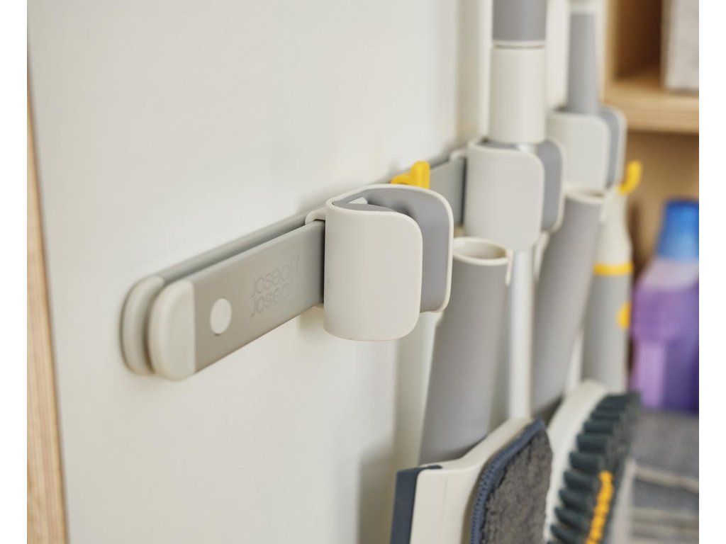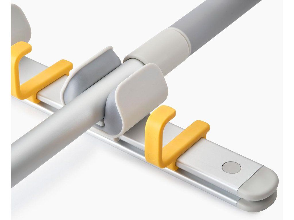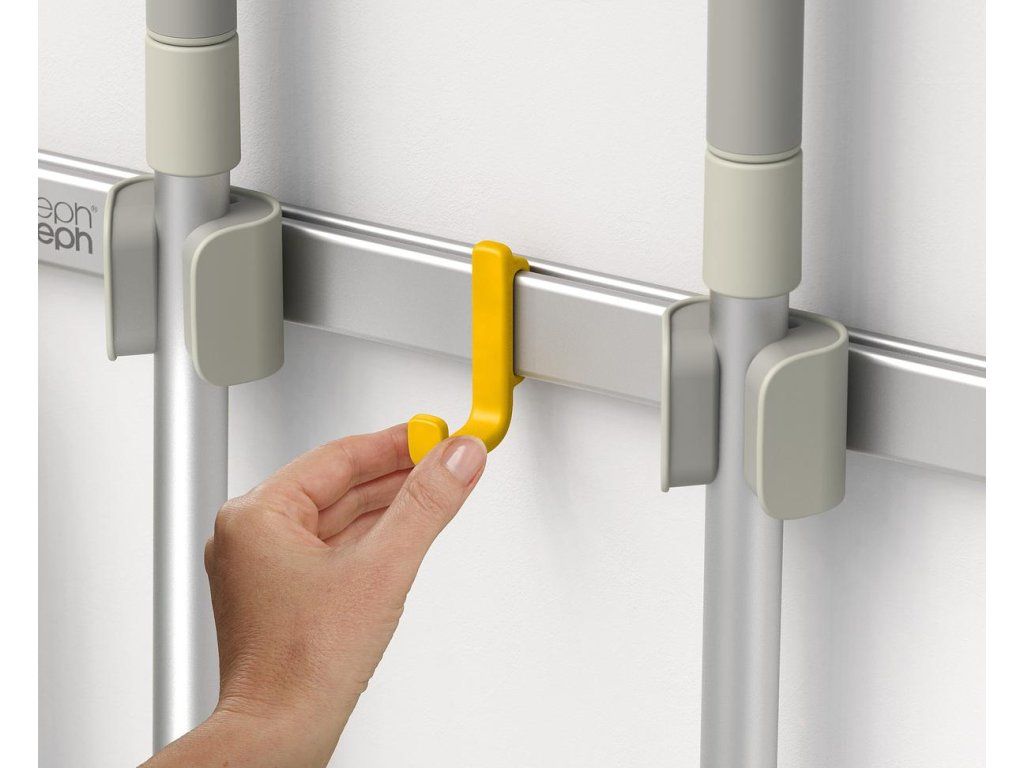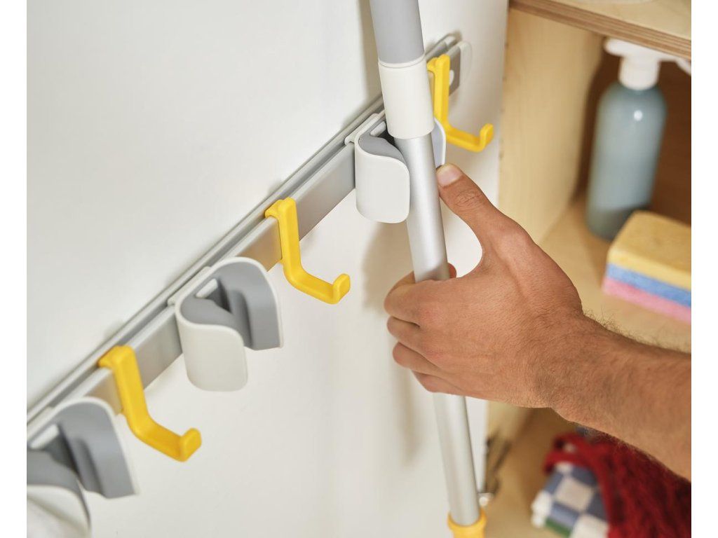 Nástěnná hliníková lišta JOSEPH JOSEPH CleanTech 6500016 se třemi nastavitelnými háčky a třemi úchyty na tyče - pro bezpečné a prostorově úsporné uložení. Určena pro úklidové nástroje řady CleanTech™, vhodná i pro jiné nástroje odpovídajících rozměrů. Úchyty udrží tyče o průměru od 16 mm do 26 mm. Snadná instalace pomocí přiložených vrutů. Otírejte vlhkým hadříkem. Nepoužívejte abrazivní hadříky ani agresivní chemické čisticí prostředky. Pro dobrou stabilitu pravidelně kontrolujte a utahujte vruty.