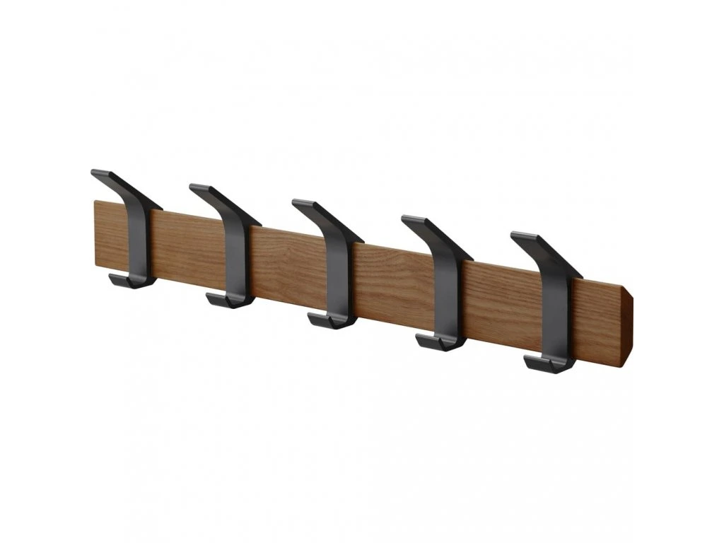 Nástěnný dřevěný věšák s posuvnými aluminiovými háčky YAMAZAKI Rin 4115. Instalace na vruty s hmoždinkami. Velikost: 10 x 50 x 6,5 cm (VxŠxH).