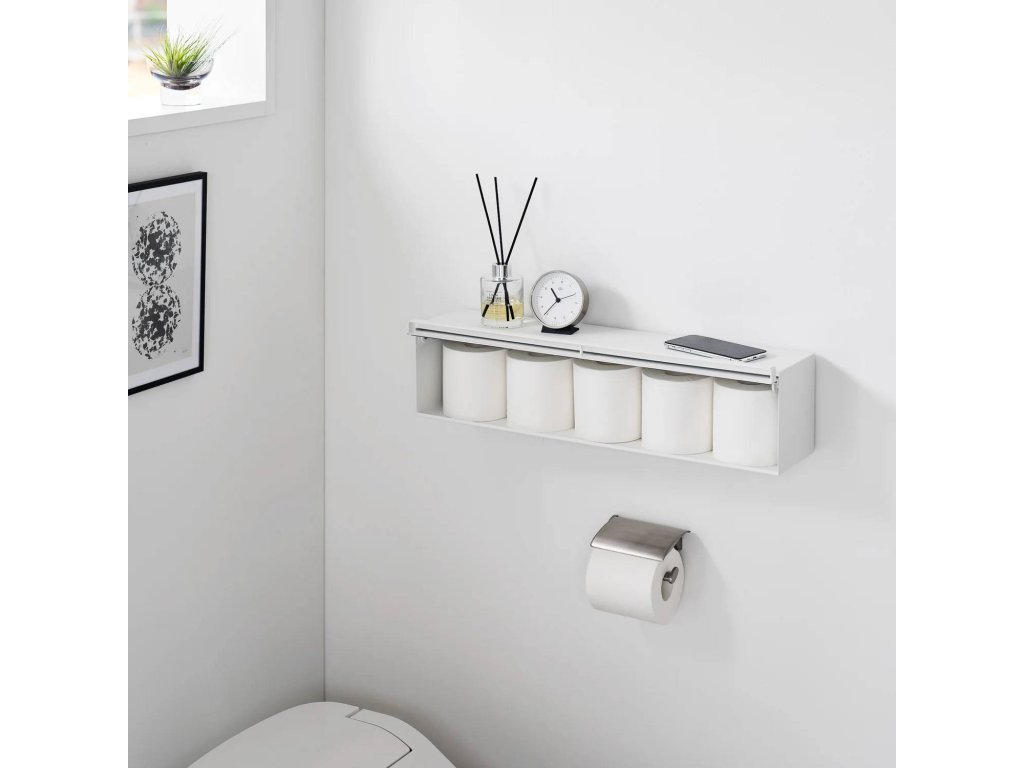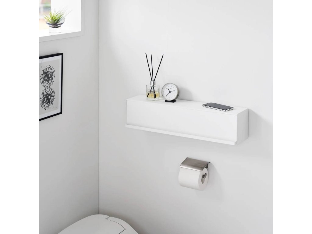 Nástěnný kovový zásobník na toaletní papír a hygienické potřeby – YAMAZAKI Tower 10068 (bílý) / 1069 (černý). Výklopné zasouvací víko zakrývá obsah zásobníku a zároveň umožňuje snadný přístup k uloženým předmětům. Madlo víka lze užít jako tyč na ručník.