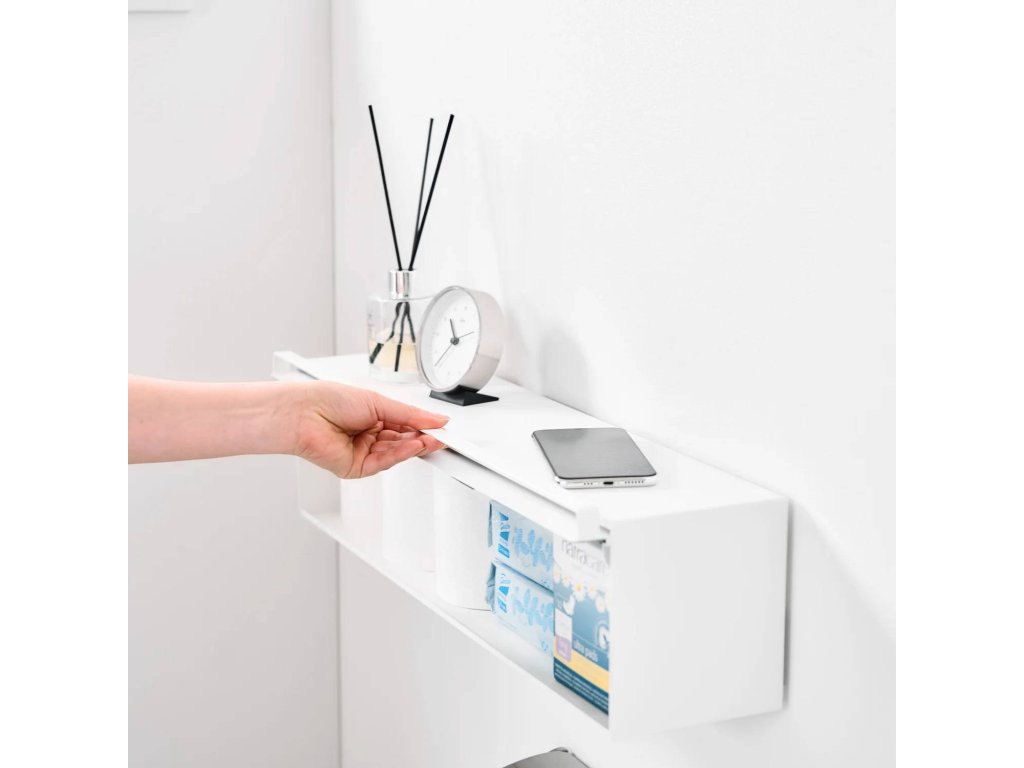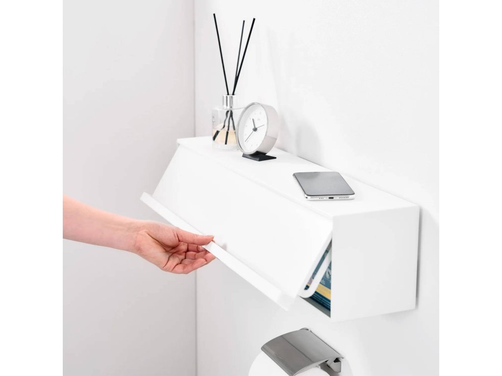 Nástěnný kovový zásobník na toaletní papír a hygienické potřeby – YAMAZAKI Tower 10068 (bílý) / 1069 (černý). Výklopné zasouvací víko zakrývá obsah zásobníku a zároveň umožňuje snadný přístup k uloženým předmětům. Madlo víka lze užít jako tyč na ručník.