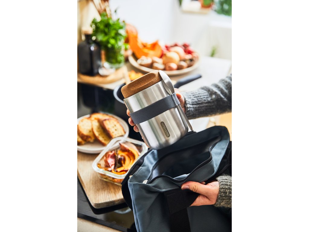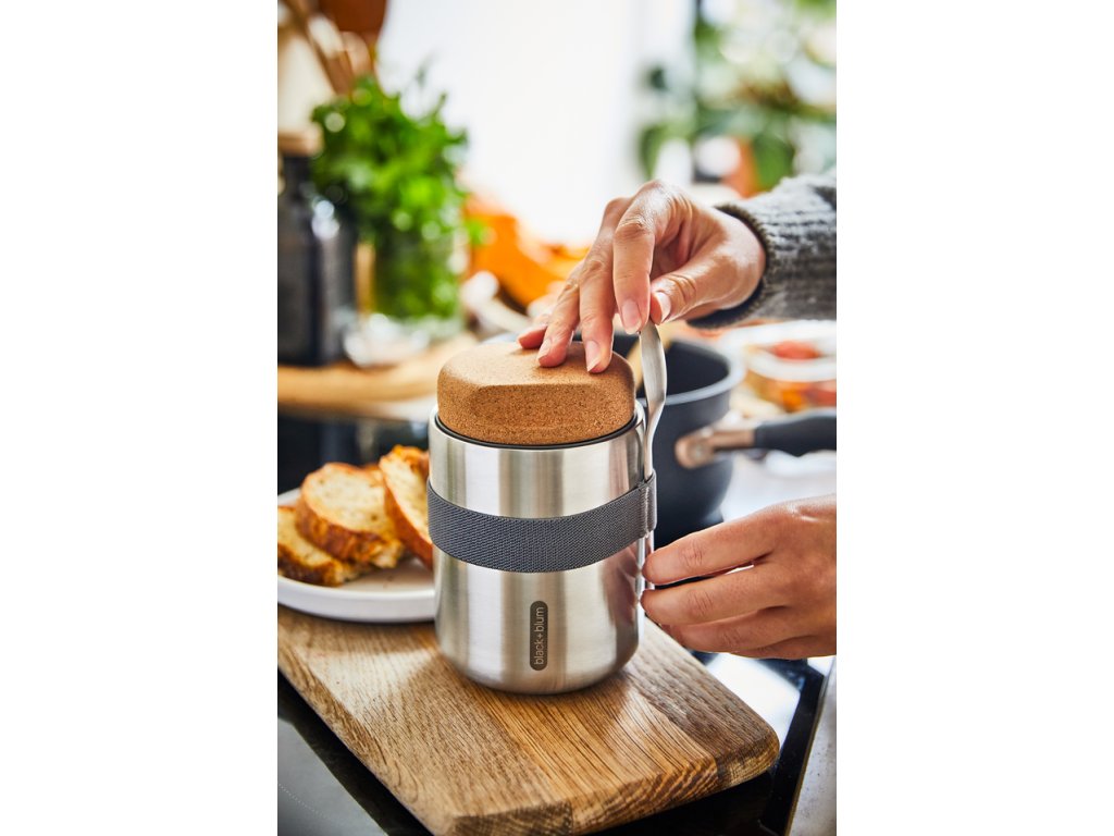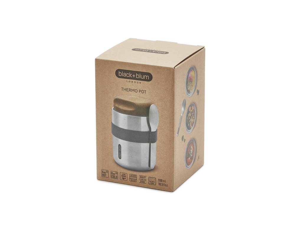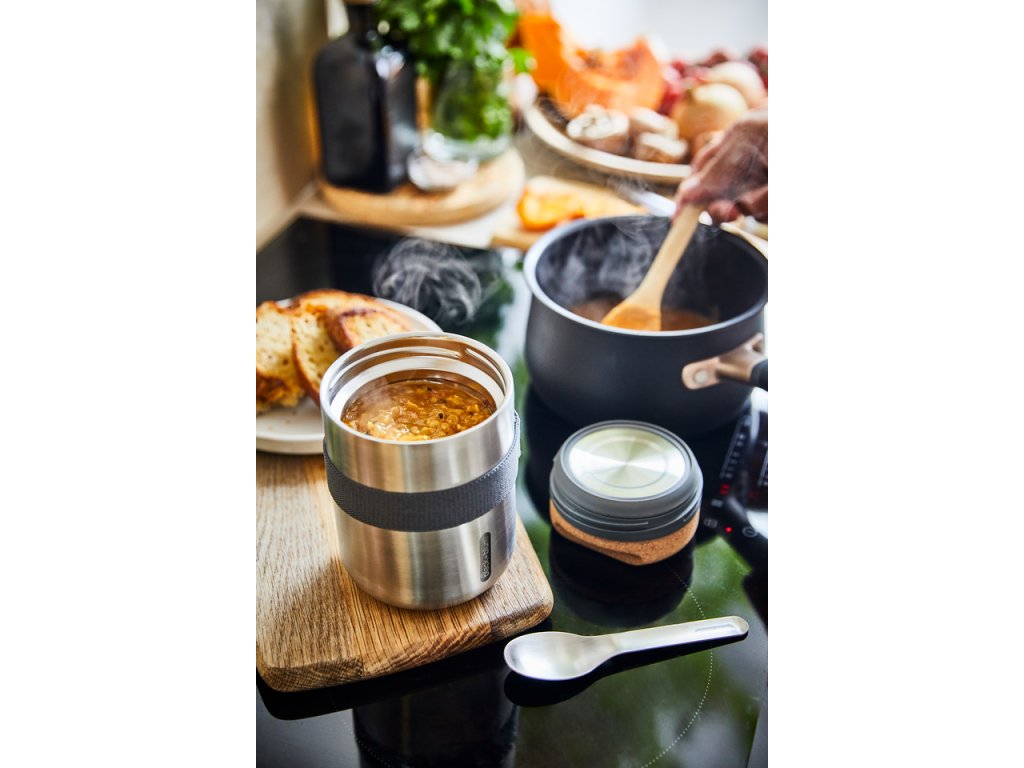 Vakuově izolovaná nerezová termoska o objemu 550 ml . Dvoustěnná – 100% nepropustná - izolovaná vysoce kvalitní nerezová ocel. Do kontaktu s potravinami přicházejí pouze nerezové části. Termoska udrží jídlo teplé 6 hodin nebo studené 8 hodin. Víčko z přírodního korku s drážkami pro lepší uchopení. Součástí balení je nerezová lžička a nylonový popruh.