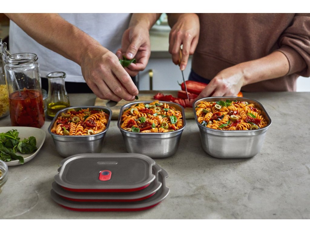- Snadné skladování – boxy i víčka jsou stohovatelné a šetří místo v kuchyni.