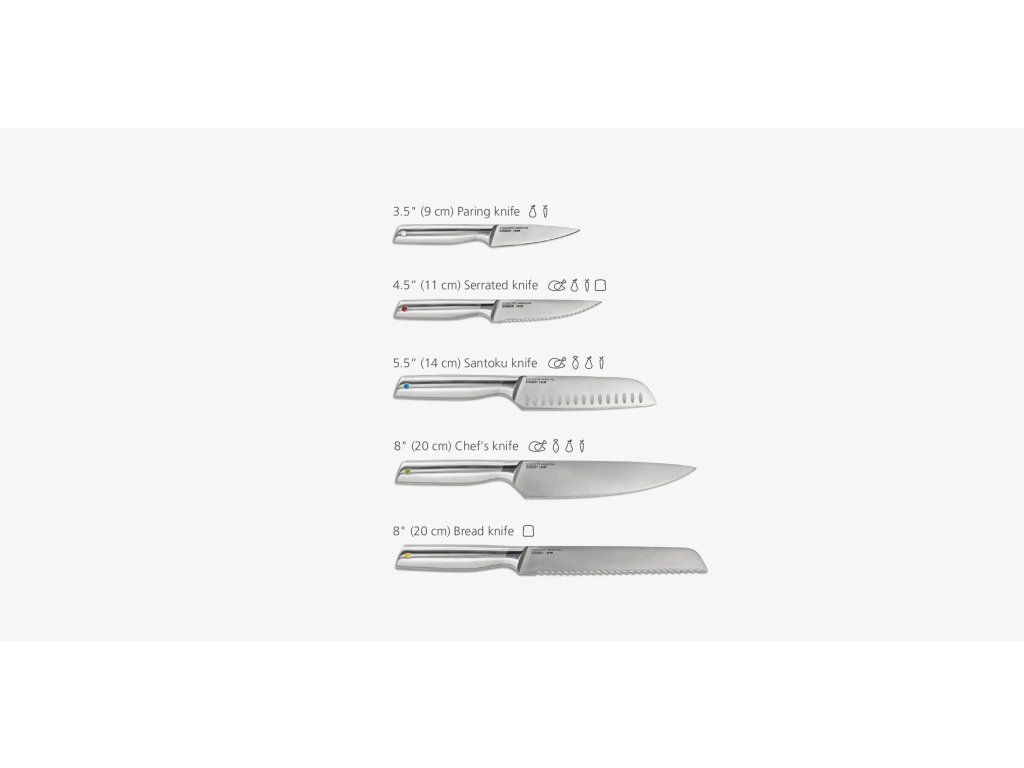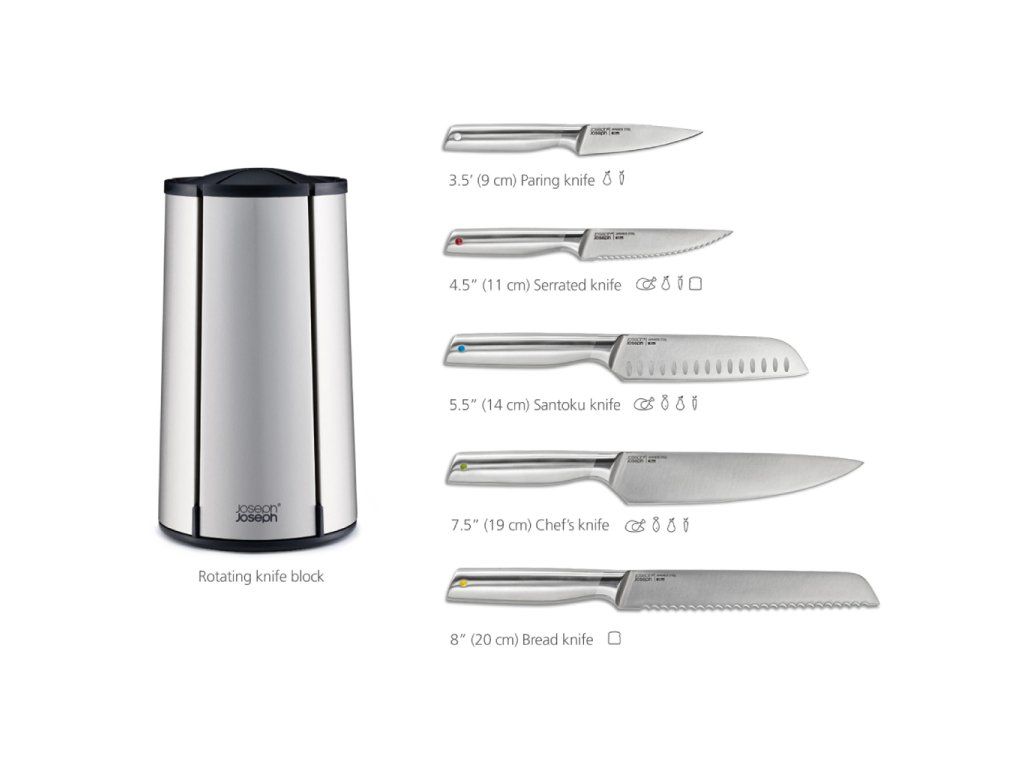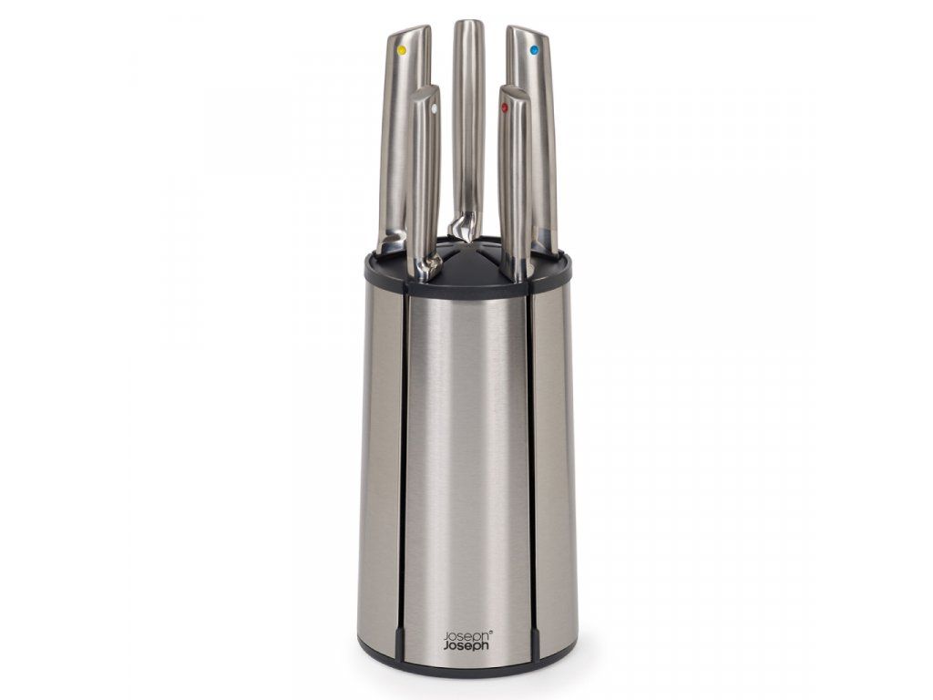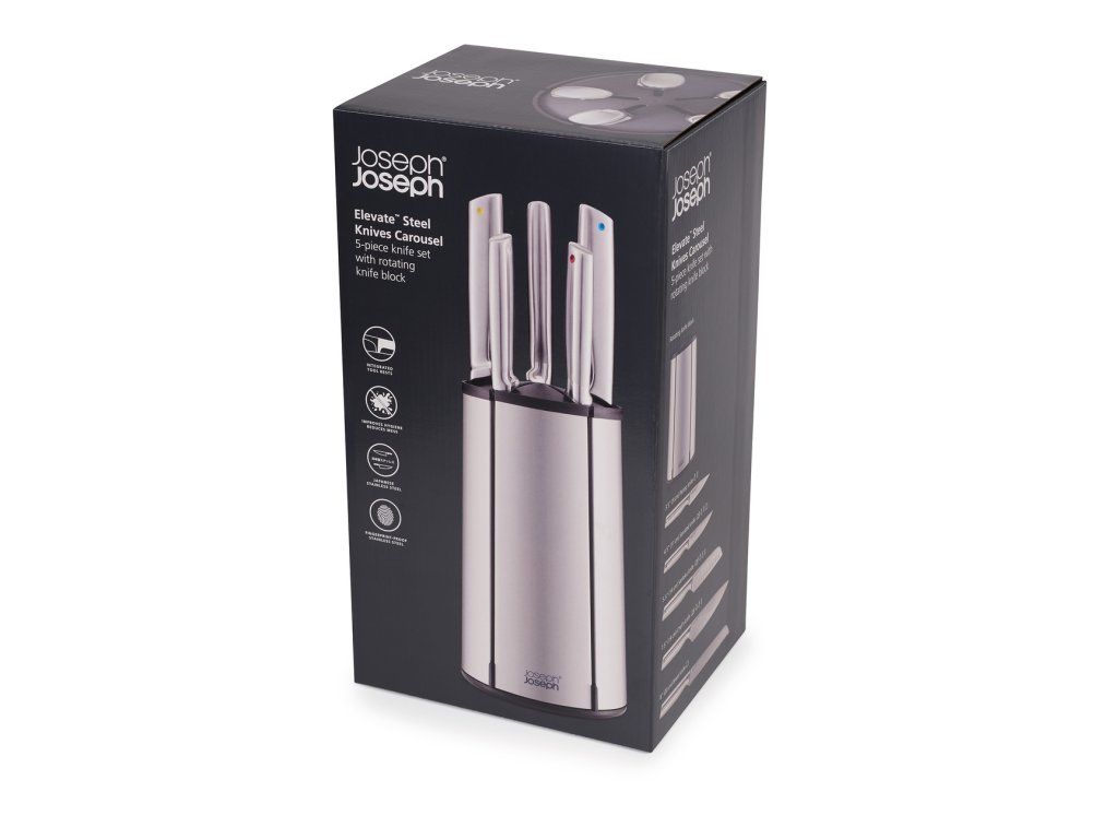 Sada nožů s otočným stojanem JOSEPH JOSEPH Elevate Steel 10456. Kuchyňské nože z japonské nerezové oceli. Ergonomická madla Elevate pro zlepšení hygieny pracovní plochy - s integrovanou opěrkou zajišťující, že se po odložení čepel nože nedotkne pracovní plochy. Nože se do otočného stojanu snadno vkládají podélnou mezerou v korpusu stojanu. Stabilitu nožů ve stojanu zajišťují vnitřní magnety. Nože mohou být do slotů vkládány nezávisle na velikosti čepele. Nerezový povrch s fingerprint-proof úpravou odolný proti zanechávání otisků prstů.