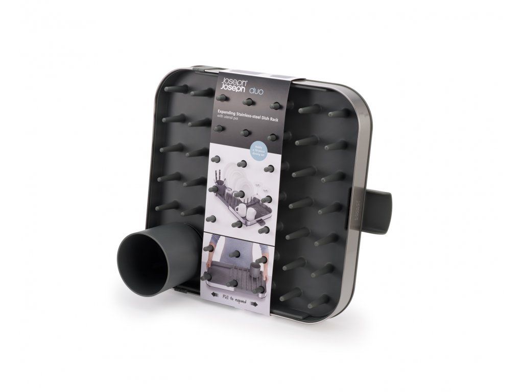 Rozšiřovatelný odkapávač JOSEPH JOSEPH Duo Steel umožňuje snadné zvětšení odkapávací plochy na téměř dvojnásobek původní velikosti. Odkapávaná voda je odváděna hubičkou přímo do dřezu. Základní plocha s hrotovými držáky je vhodná pro všechny druhy nádobí včetně sklenic. Rozšiřitelná rovná plocha je ideálním prostorem pro odkapávání šálků a misek. Odkapávač příborů je flexibilně odnímatelný. Odkapávač má protiskluzné nožky zajišťující jeho stabilitu na pracovní desce. Odkapávač lze snadno rozebrat a čistit. Všechny díly myjte a sušte ručně.