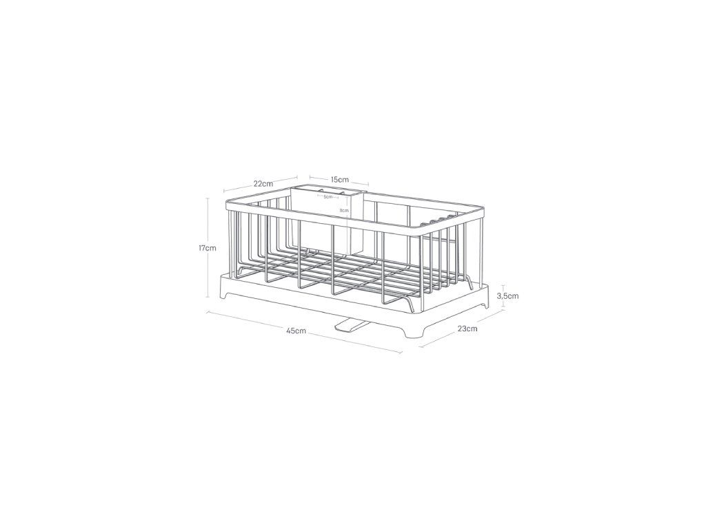 Odkapávač nádobí YAMAZAKI Tower 2876 z kovu a plastu. Polohovací hubice na odtok vody do dřezu. Velikost: 23 x 42 x 17 cm.